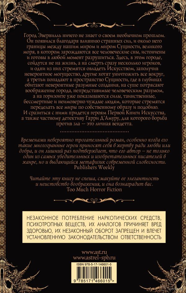 Город Эвервилль ничего не знает о своем необычном прошлом. Он появился благодаря влиянию странных сил, и около него границы между нашим миром и миром Сущности, великого моря, в котором зарождаются все человеческие сны, истончены и готовы в любой момент разрушиться. Здесь, в этом городе, сойдутся не на жизнь, а на смерть сразу несколько игроков, и одни из них стремятся овладеть Искусством, заполучив невероятное могущество, другие хотят уничтожить все вокруг, а третьи попадают в пространство Сущности, где в глубинах обитают невероятные разумные создания, на суше потрясают воображение города, непредставимые человеческим разумом, а на горизонте уже показываются силы, таинственные, бессмертные и неимоверно чуждые людям, которые стремятся переделать все миры по собственному образу и подобию. И сразиться с ними придется героям Первой Книги Искусства, а также частному детективу Гарри Д’Амуру, для которого борьба против зла – это личная вендетта.