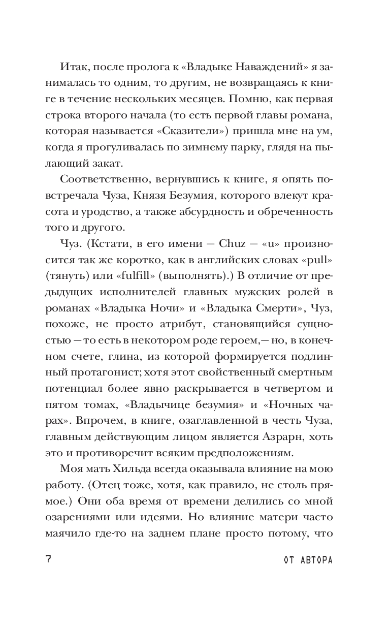 Это история о непредсказуемом и безумном князе Чузе, Владыке Наваждений, что с одной стороны похож на прекрасного юношу, а с другой – на нечто ужасное. Повелитель сумасшествия, он осмеливается бросить вызов Азрарну, Владыке Ночи, властителю Подземья. Это история о том, как Азрарн, источник обмана и раздора, в своем бесконечном честолюбии пришел напомнить людям, что когда-то спас мир, но в результате совершенно неожиданно для себя обрел подлинную любовь. Это история об Азрьяз, дочери Азрарна, самой могущественной и страшной царице Плоской Земли, пожелавшей выбраться из-под проклятия своего отца, но навлекшей на себя гнев богов, наконец-то взглянувших на обитель людей. Это история о пришествии ангелов, перед которыми не может устоять ничто. А еще это история о бесконечных просторах, морских глубинах, древних тайнах, крае земли, а также об искуплении и прощении, ведь в необъятном мире Плоской Земли возможно всё.