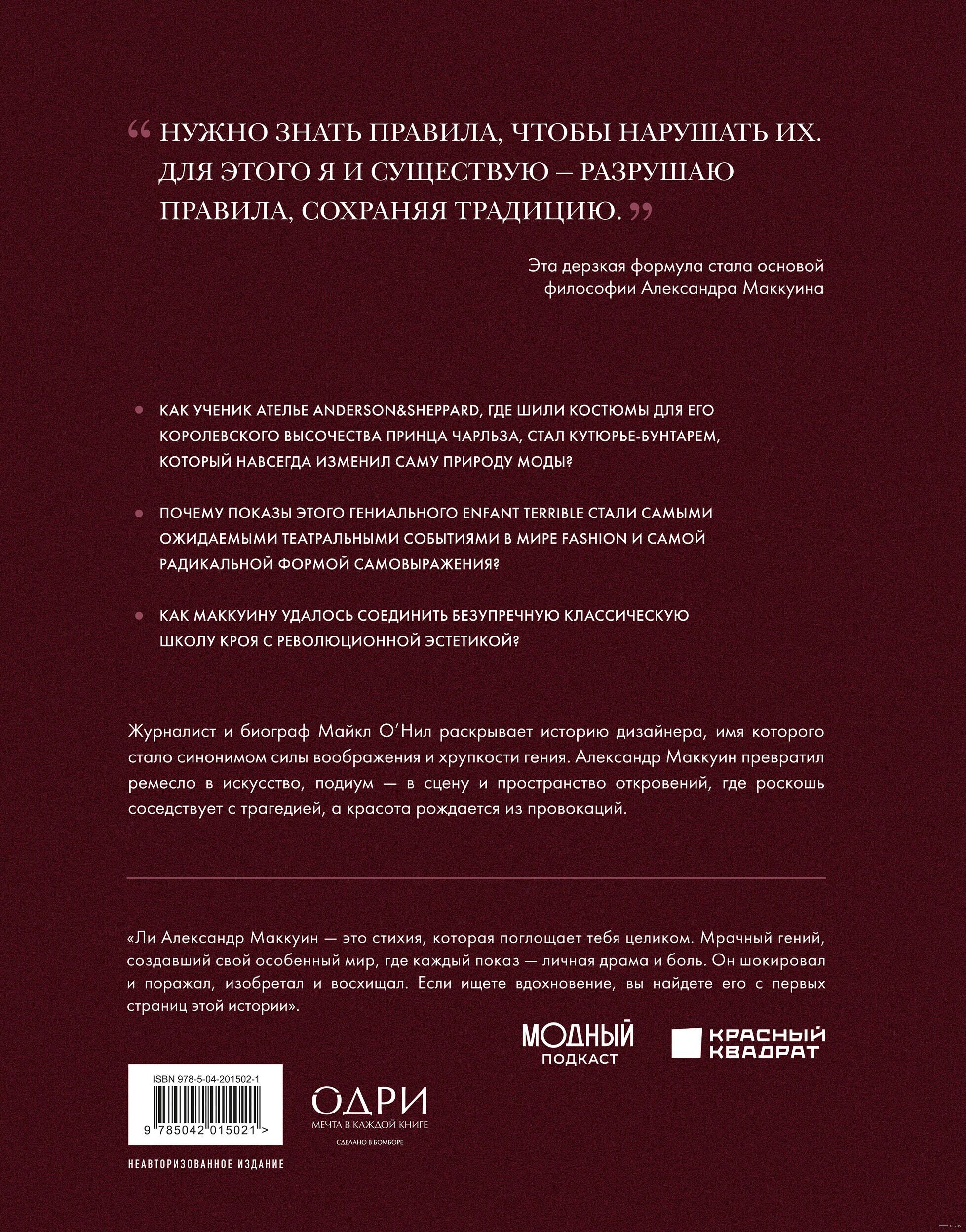 Александр Маккуин был революционером визуального языка моды. Автор книги Майкл О’Нил поднимает завесу над малоизвестными этапами жизни творца, показывая, как юноша из скромной лондонской семьи превратился в культовую фигуру fashion-мира, чья карьера была полна драм, скандалов, взлетов и падений. Редкие архивные фотографии, эскизы и закулисные кадры раскрывают путь мастера, для которого мода стала формой исповеди и искусства на грани.