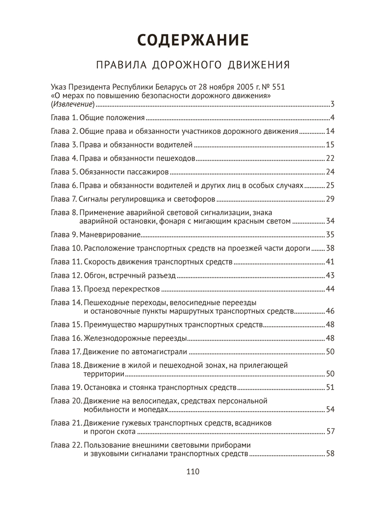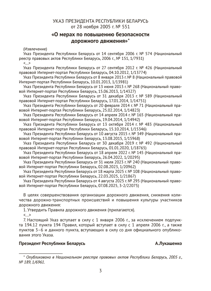 В издание включены Правила дорожного движения, утвержденные Указом Президента Республики Беларусь от 28 ноября 2005 г. № 551 "О мерах по повышению безопасности дорожного движения", с изменениями, внесенными Указом Президента Республики Беларусь от 4 августа 2025 г. № 295 "Об изменении Указа Президента Республики Беларусь". Также издание содержит нормы административной ответственности за правонарушения в области дорожного движения.