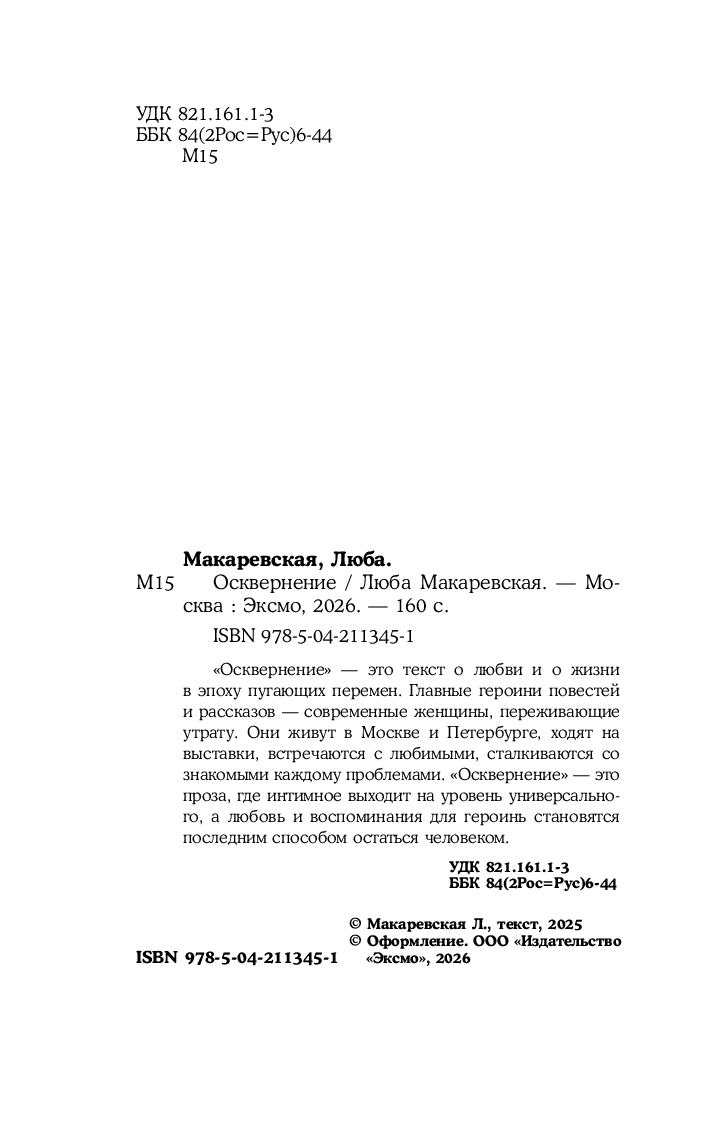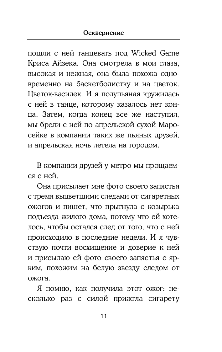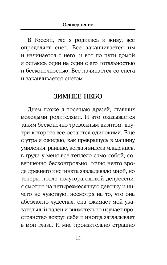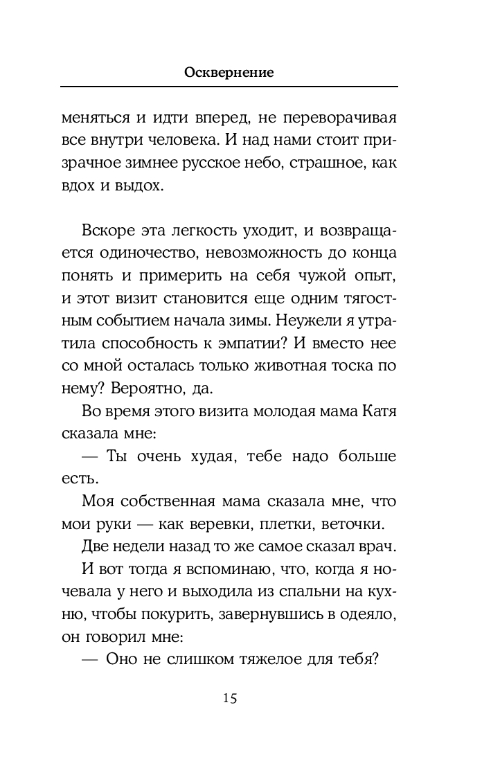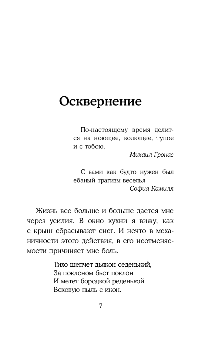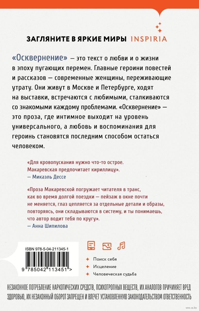 "Осквернение" – это текст о любви и о жизни в эпоху пугающих перемен. Главные героини повестей и рассказов – современные женщины, переживающие утрату. Они живут в Москве и Петербурге, ходят на выставки, встречаются с любимыми, сталкиваются со знакомыми каждому проблемами. "Осквернение" – это проза, где интимное выходит на уровень универсального, а любовь и воспоминания для героинь становятся последним способом остаться человеком.