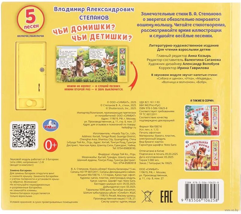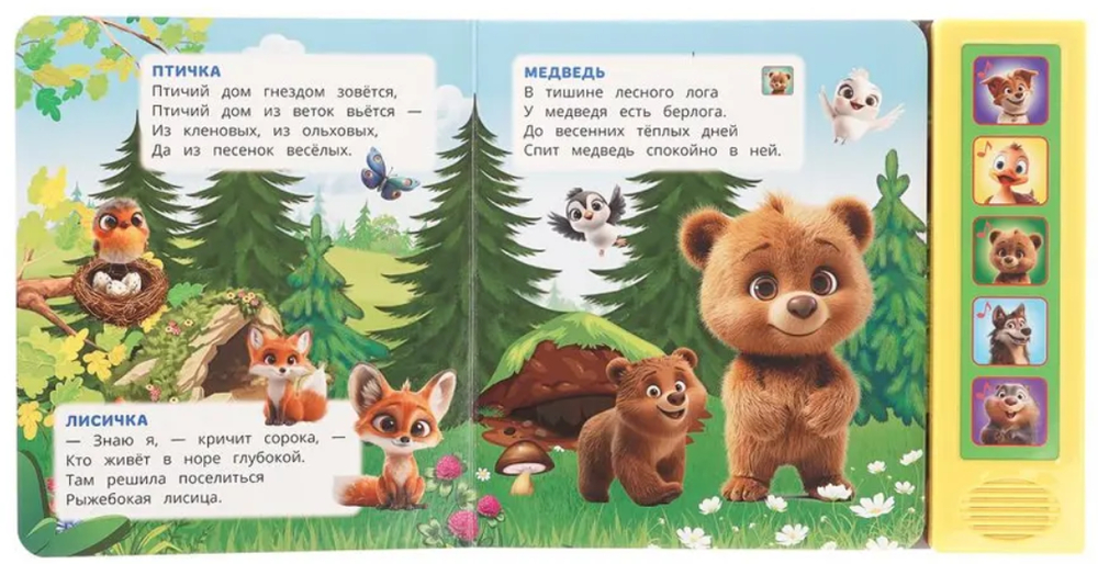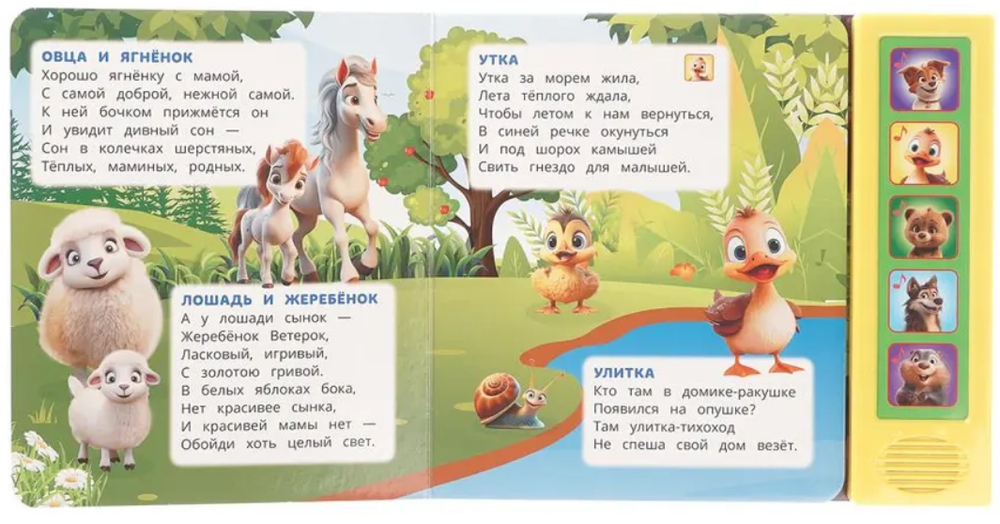 Ребёнок с удовольствием будет листать плотные страницы, рассматривать яркие картинки, вместе с родителями читать замечательные стихи Владимира Степанова и, конечно, нажимать на кнопки и слушать мелодичные песенки. Малыш легко освоит включение звука: по нажатию на кнопку песенка включится, при втором нажатии выключится. Благодаря компактному размеру книгу удобно взять с собой в дорогу.