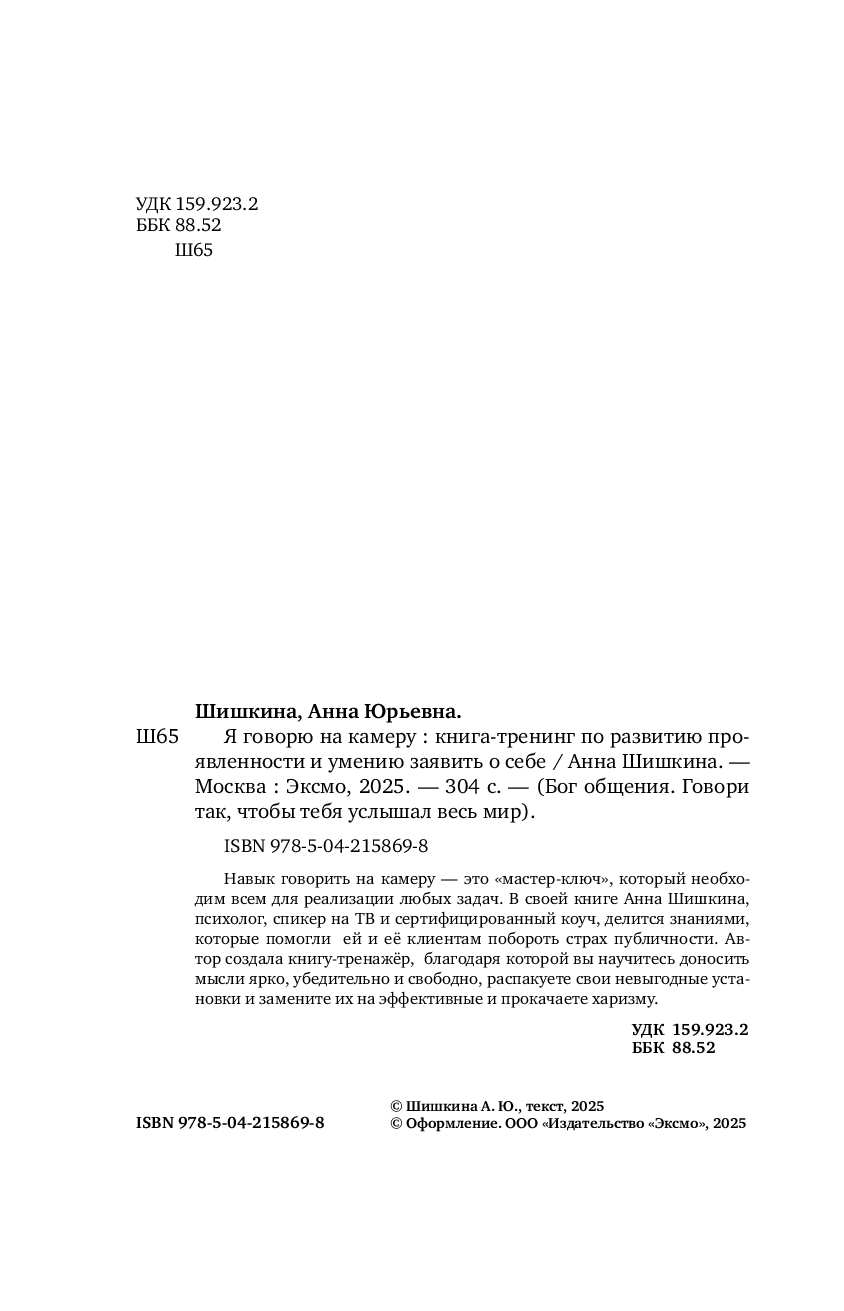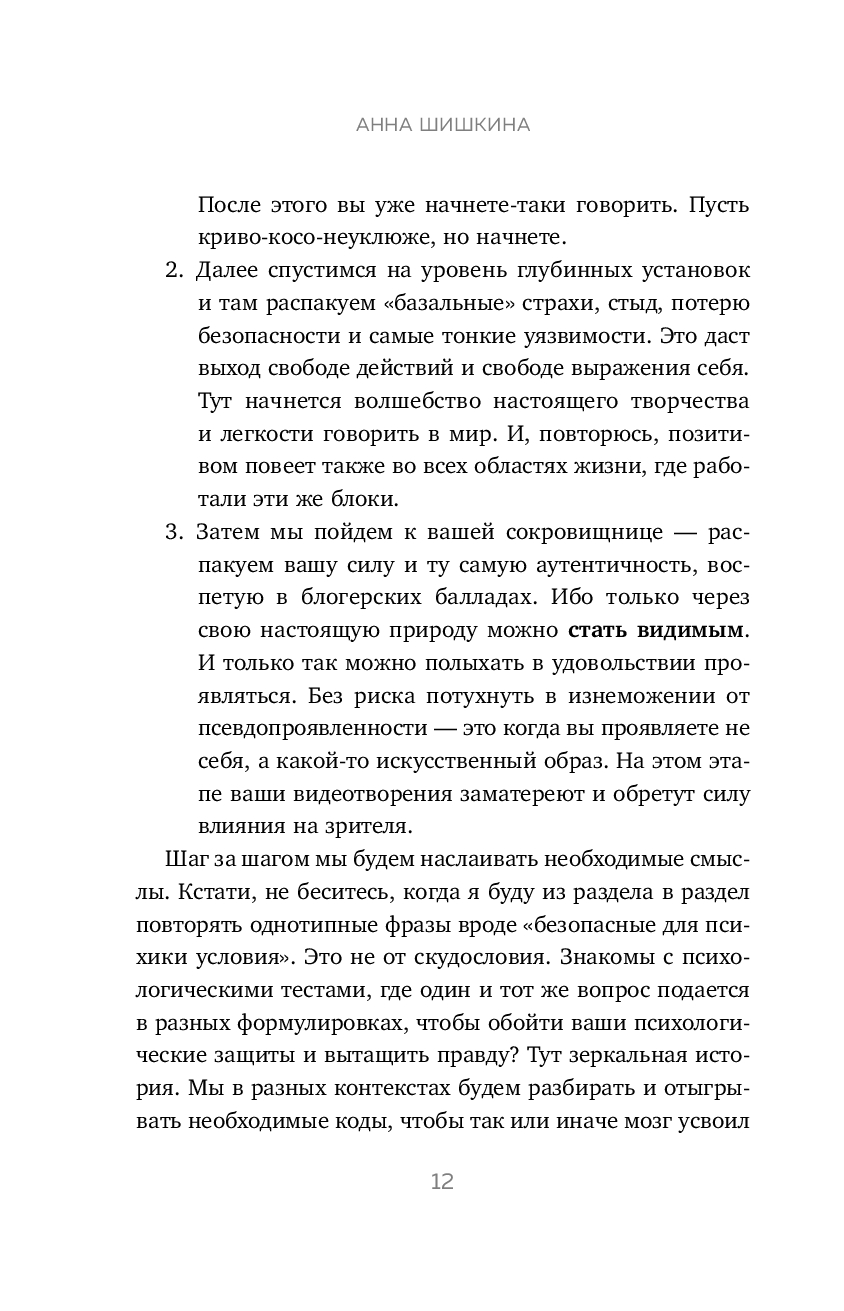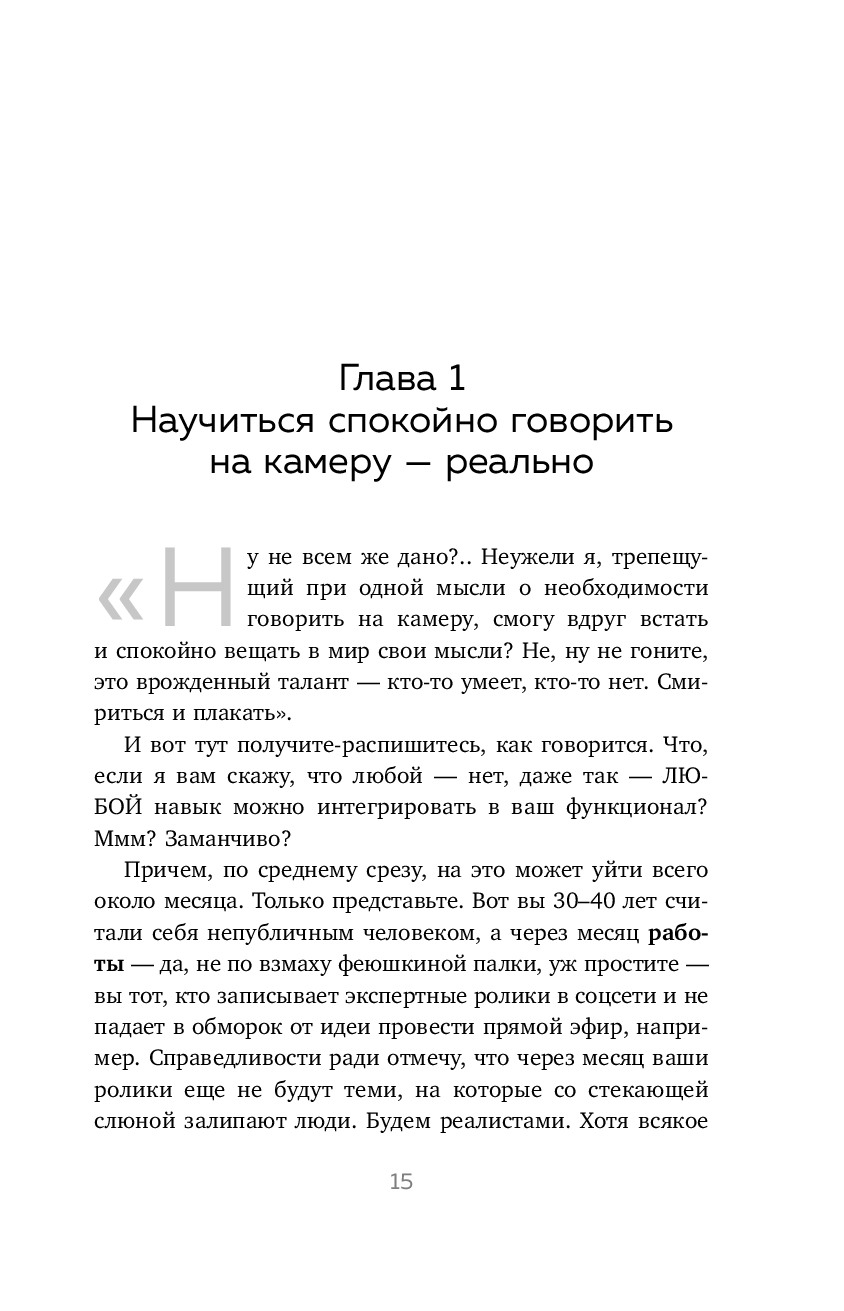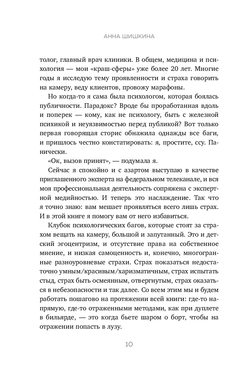 Искусство говорить на камеру открывает многие двери. Это навык, который помогает построить карьеру, расширить бизнес, стать крутым экспертом, а также дает возможность самовыразиться и наполнить жизнь новыми впечатлениями. В своей книге Анна Шишкина, психолог, спикер на ТВ и сертифицированный коуч, делится знаниями, которые помогли ей и ее клиентам побороть страх публичности. Автор создала книгу-тренажёр, благодаря которому вы будете свободно чувствовать себя в кадре, говорить без запинок и сделаете камеру мощным инструментом для карьеры и творчества.