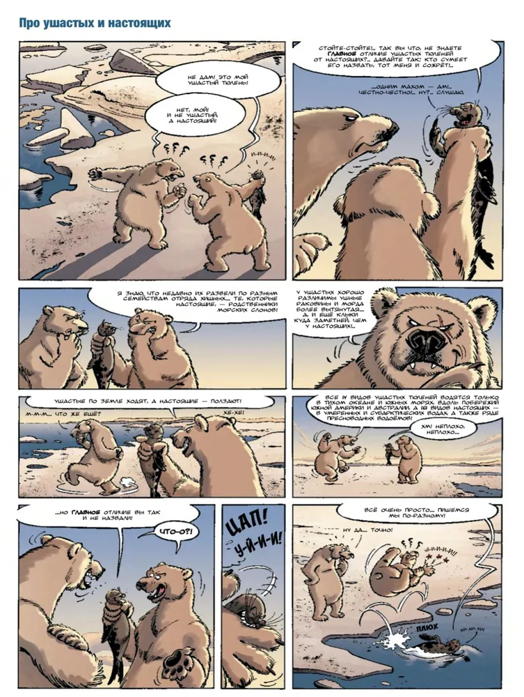 Впрочем, среди героев 4-го тома немало и тех, у кого с водной средой связана лишь часть жизни: тюлени (кстати, сможете быстро назвать ГЛАВНОЕ отличие ушастых тюленей от настоящих?), моржи (интересно, почему эта громада не тонет?), морские слоны (зачем он так ревёт, спрашивается?), пингвины (которые знают про айсберги буквально всё!). А также белые медведи, люди и даже куры – в качестве персонажей второго плана. И, разумеется, главная звезда 4-го тома: золотая рыбка! Точнее, золотые рыбки, ведь их же много... Очень много!.. Очень-очень много!