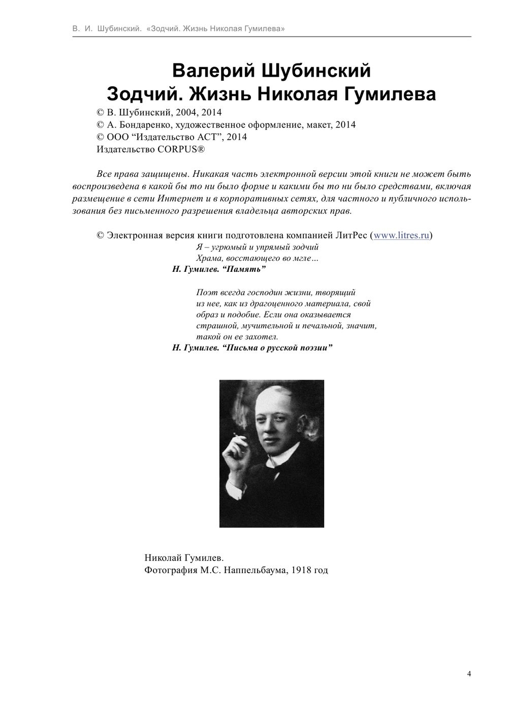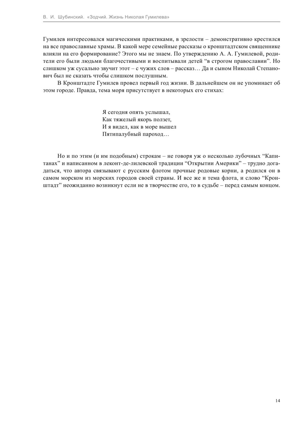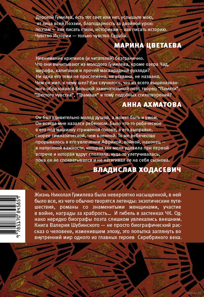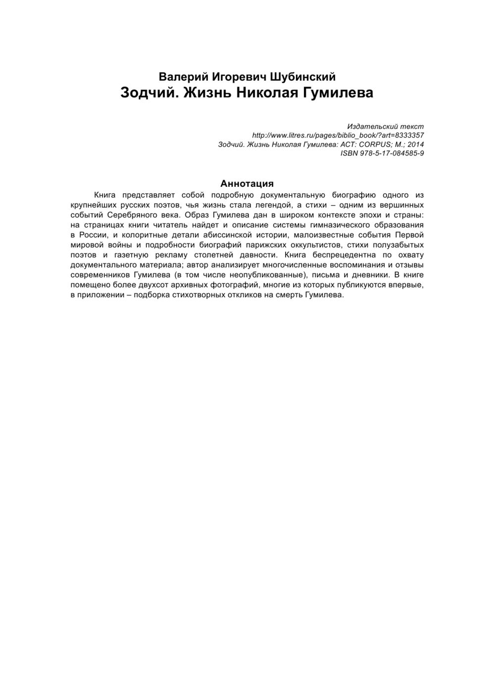 Книга представляет собой подробную документальную биографию одного из крупнейших русских поэтов, чья жизнь стала легендой, а стихи – одним из вершинных событий Серебряного века. Образ Гумилева дан в широком контексте эпохи и страны: на страницах книги читатель найдет и описание системы гимназического образования в России, и колоритные детали абиссинской истории, малоизвестные события Первой мировой войны и подробности биографий парижских оккультистов, стихи полузабытых поэтов и газетную рекламу столетней давности.