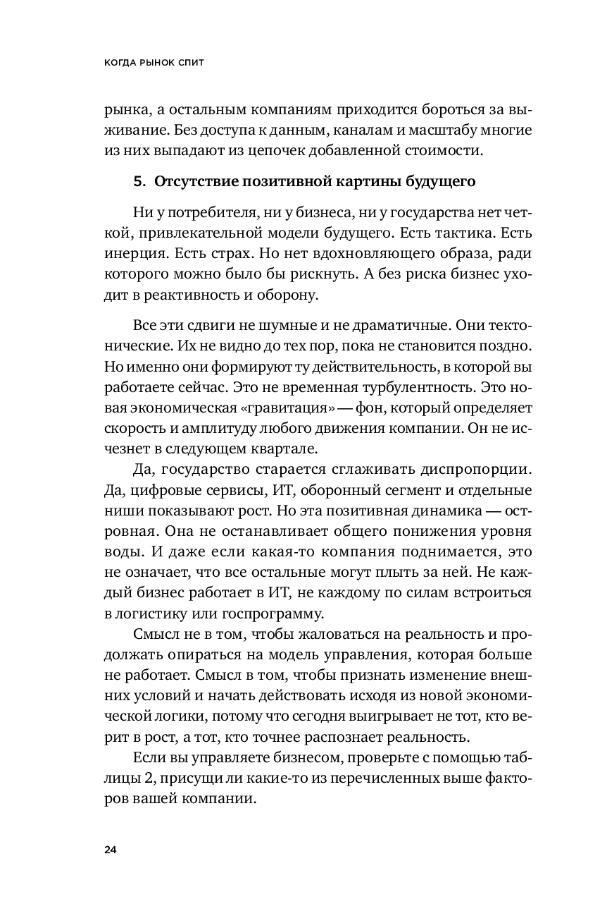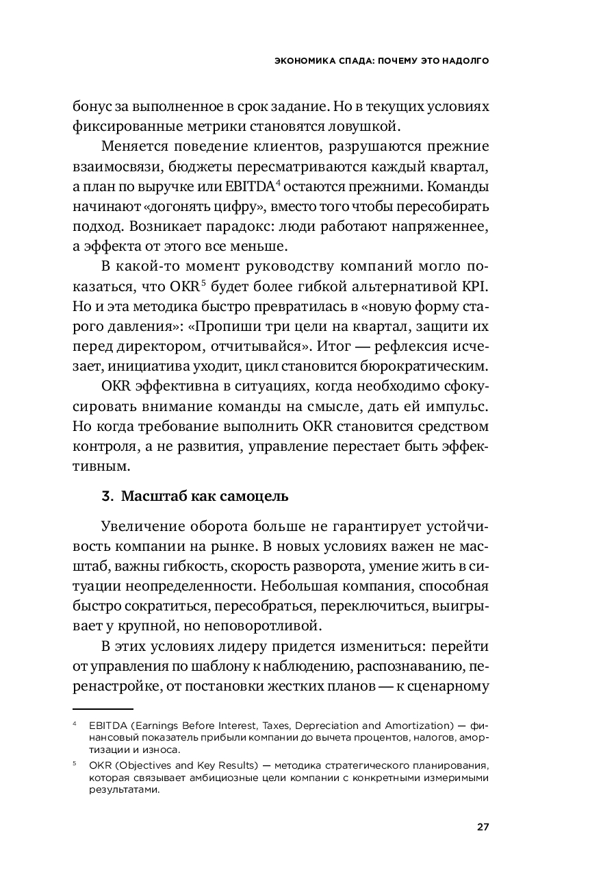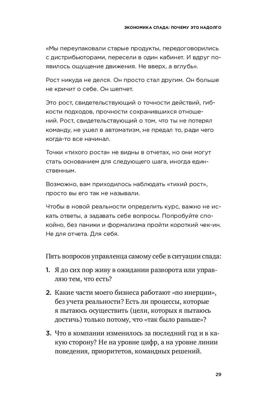 Прочтение книги, вероятно, изменит фокус с достижения амбициозных целей на сохранение жизнеспособности компании. Читатель узнает, почему в стагнации зрелость руководителя важнее харизмы, как усталость команды становится системным сигналом о проблемах и почему доверие превращается в главную валюту выживания. Все рекомендации основаны на реальном опыте управления крупными компаниями в условиях затяжного спада.