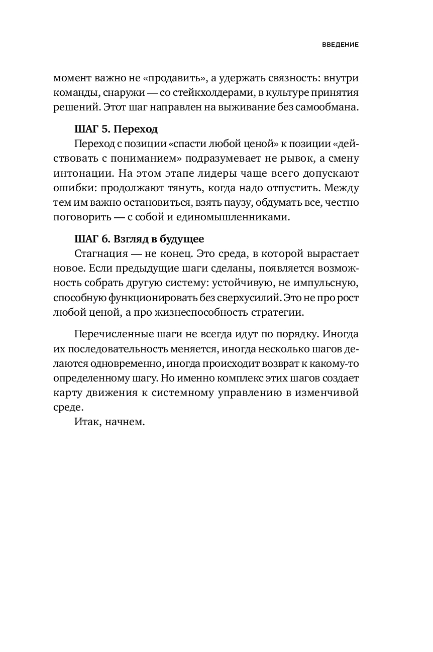 В основе книги лежит пошаговая методология из шести этапов – от осознания новой реальности до пересборки системы управления. Юлия Лахмоткина и Мэри Гукасян развенчивают типичные управленческие иллюзии вроде "Мы уже адаптировались", "Сейчас не время для изменений" или "Все дело в мотивации людей" – и показывают, как именно эти заблуждения усугубляют стагнацию. Особое внимание уделяется системному мышлению – умению видеть скрытые связи между решениями и результатами, петли усиления проблем и точки воздействия на систему.