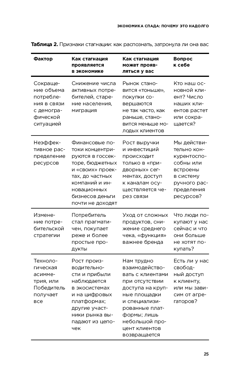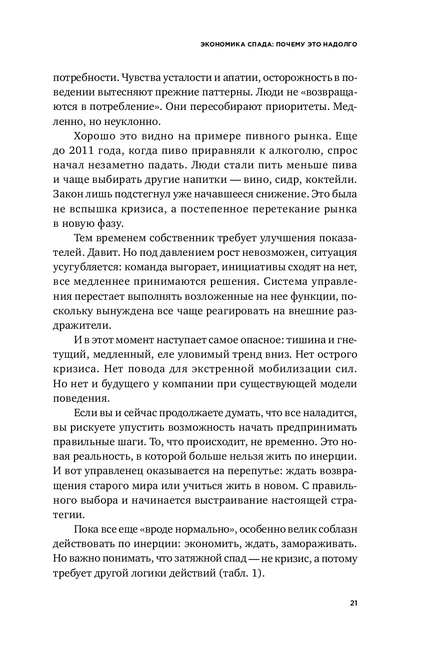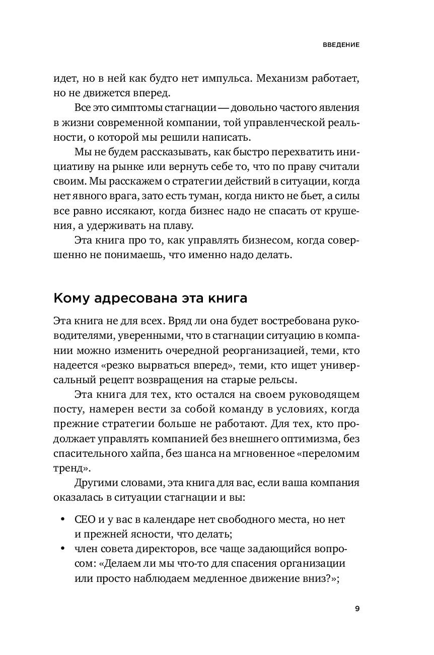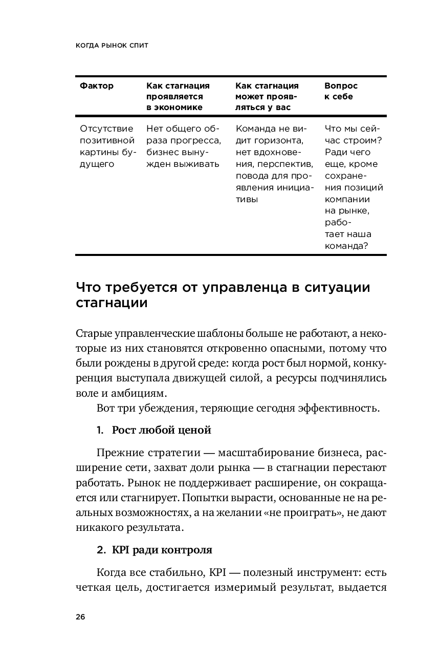Стагнацию невозможно переждать, как временный кризис: это состояние – новая реальность для многих рынков. Сегодня компании продолжают работать, но теряют импульс: сотрудники устают без видимых причин, спрос медленно падает, привычные стратегии перестают давать результат. Авторы книги предлагают признать: старые модели управления больше не работают, и это надолго – и вместо попыток форсировать рост нужен принципиально иной подход.