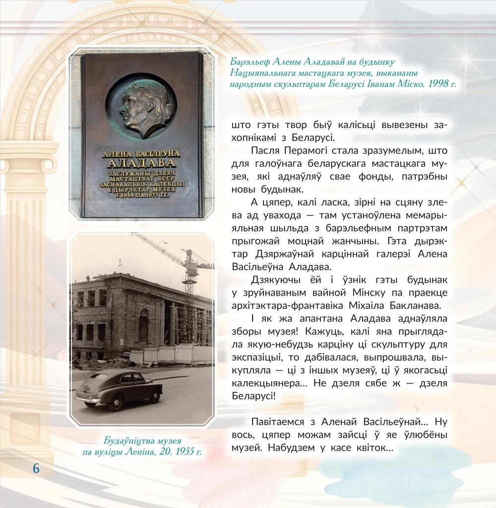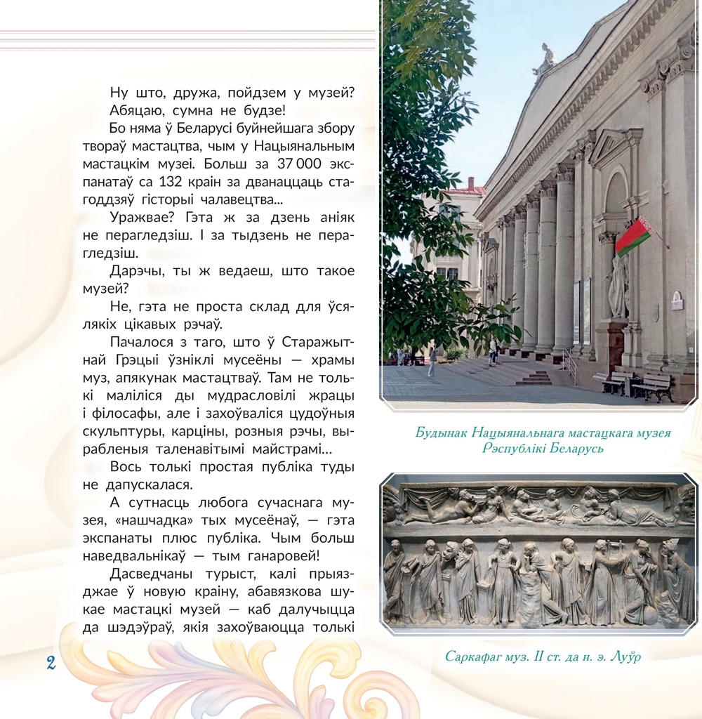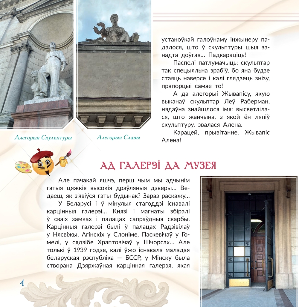 З дапамогай гэтай кнігі не толькі маленькія чытачы, але і дарослыя адкрыюць для сябе скарбы Нацыянальнага мастацкага музея Рэспублікі Беларусь, даведаюцца пра гісторыю яго стварэння і шмат незвычайных фактаў пра яго экспанаты, пачынаючы са скульптур, што ўпрыгожваюць фасад, а таксама атрымаюць магчымасць зазірнуць у філіялы музея, яго фондасховішчы і рэстаўрацыйныя майстэрні.