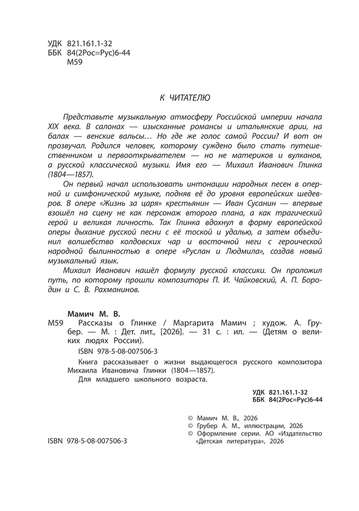 Книга рассказывает о жизни выдающегося русского композитора Михаила Ивановича Глинки (1804–1857).
