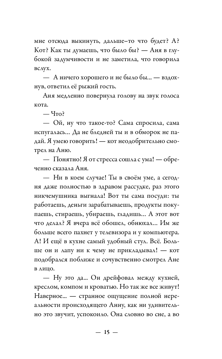 Ане повезло, подобранный на улице кот оказался говорящим! Мяун решил, что Аня ему подходит и погрузился в заботы по устройству её личной жизни. Кот трудолюбив и упорен! Союз с местными крысами, дрессировка спасенного пса, разговоры по душам с соседом и избавление Ани от общества её тётки, занимают Мяуна целиком. В результате его усилий дело движется к свадьбе, и уже даже родители жениха и невесты осознали, что говорящий кот в хозяйстве – это концентрированный позитив! Но есть люди, которых хлебом не корми, дай только причинить добро! Вот от таких Мяун и защищает Аню, и работы у него хватает!
