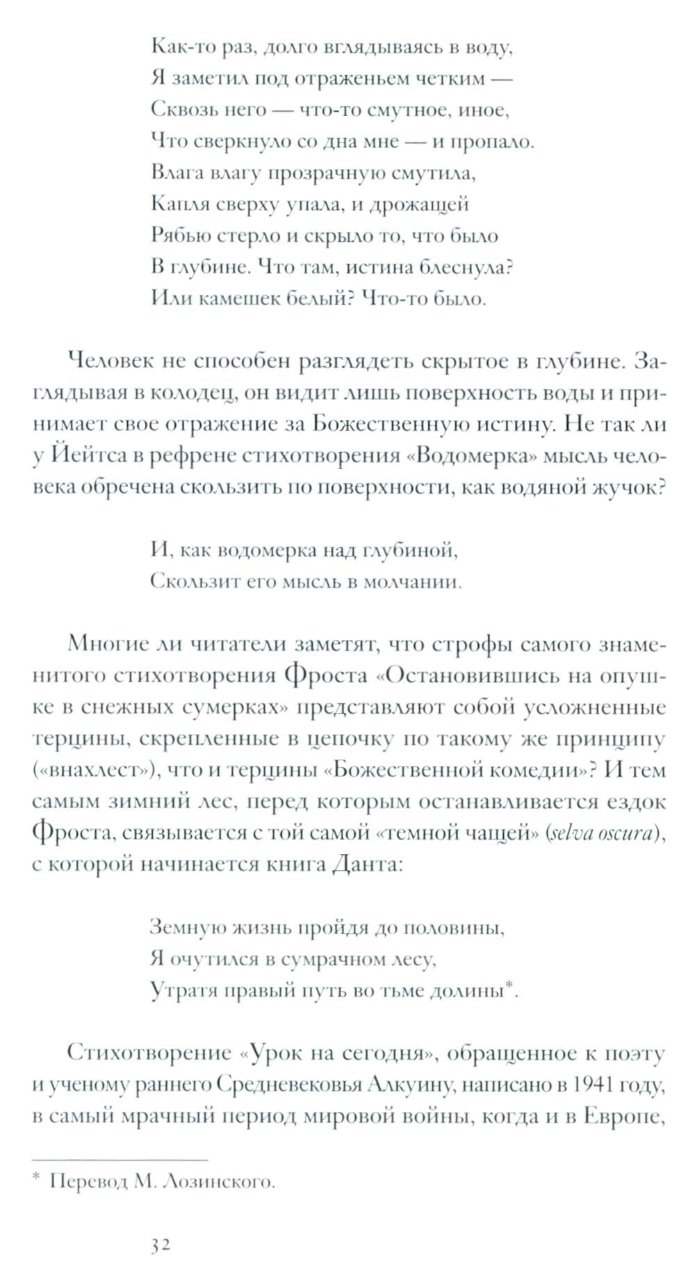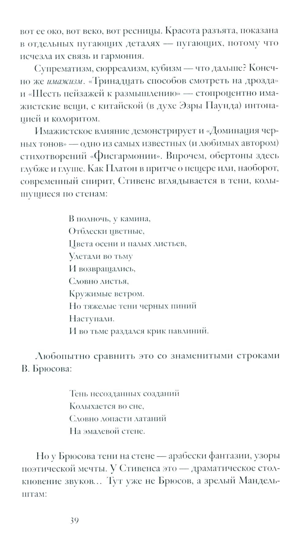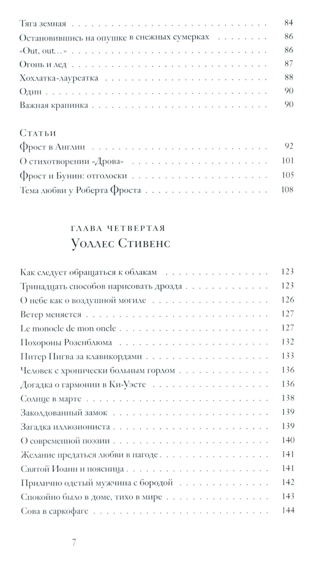 Этим авторам отдана главная часть книги; но в ней нашлось место и для других поэтов XX века: от "трансатлантических" Т. С. Элиота и У. Х. Одена до современных американских Чарльза Симика и Кей Райан. Эссеистика без стихов – слишком сухая пища, поэтому в книгу включены также избранные переводы, иллюстрирующие то, о чем говорится в статьях.