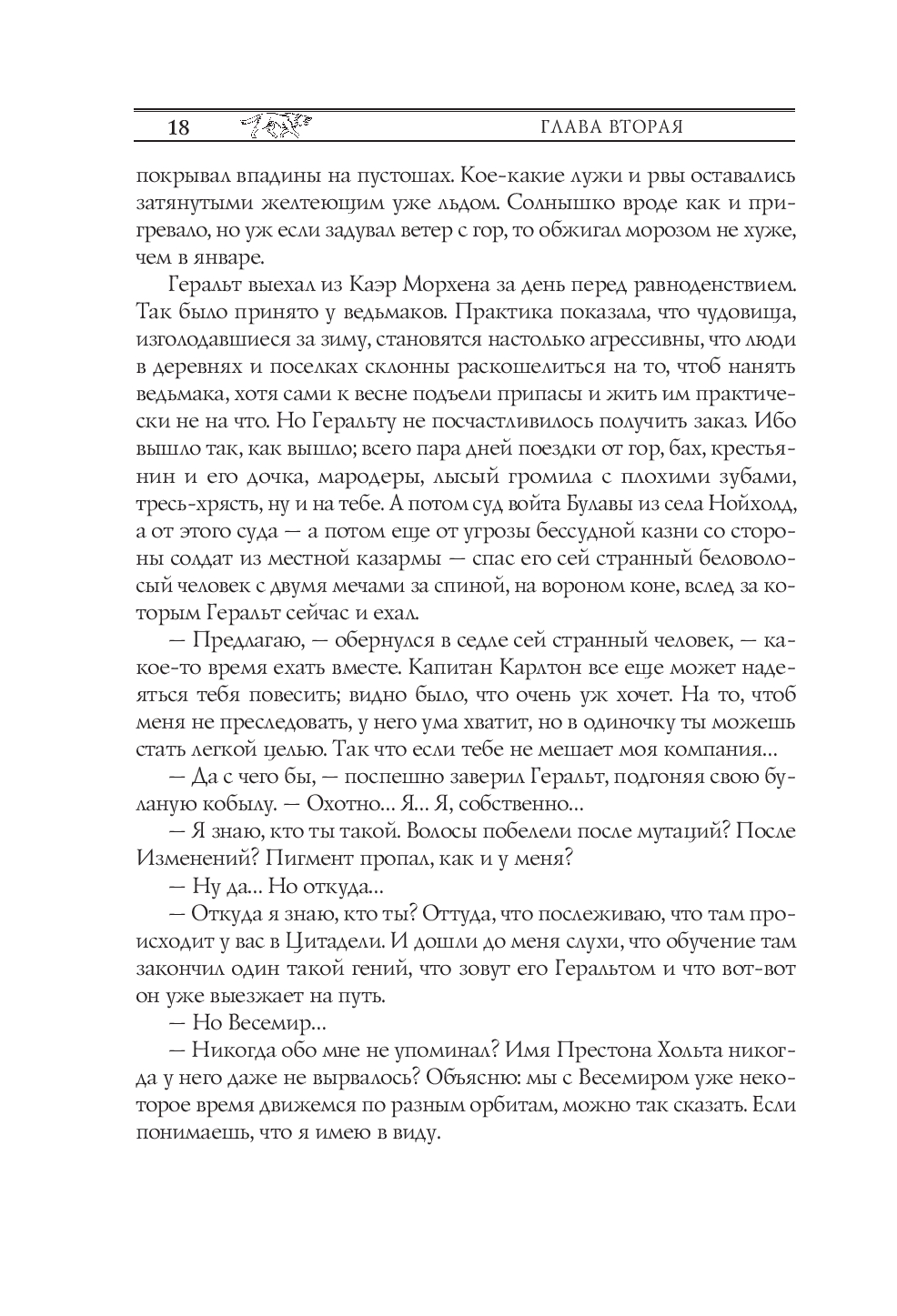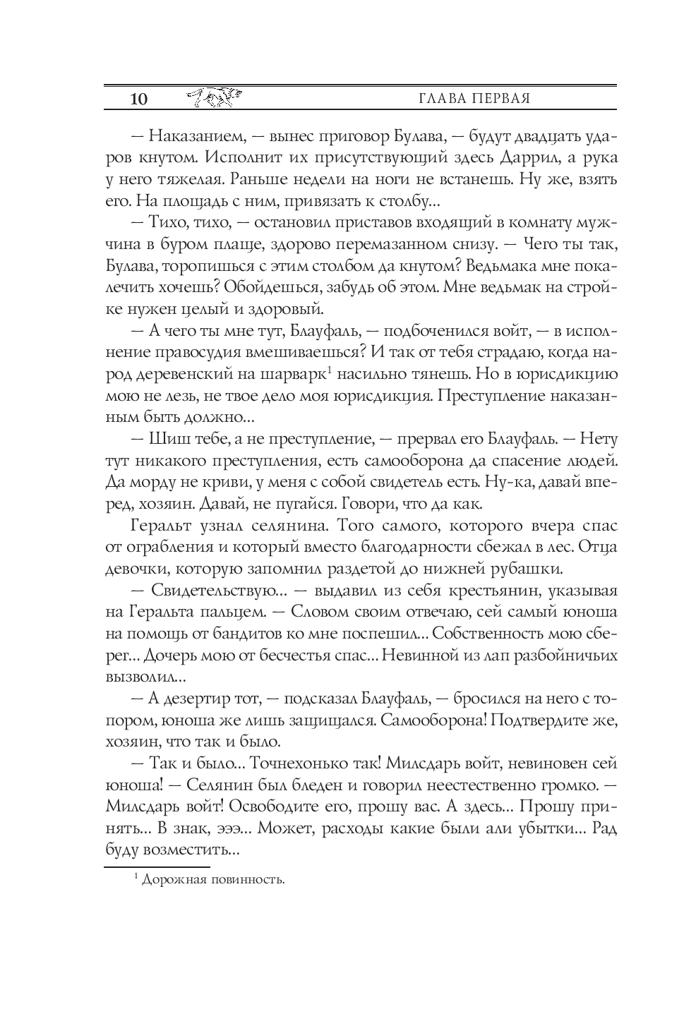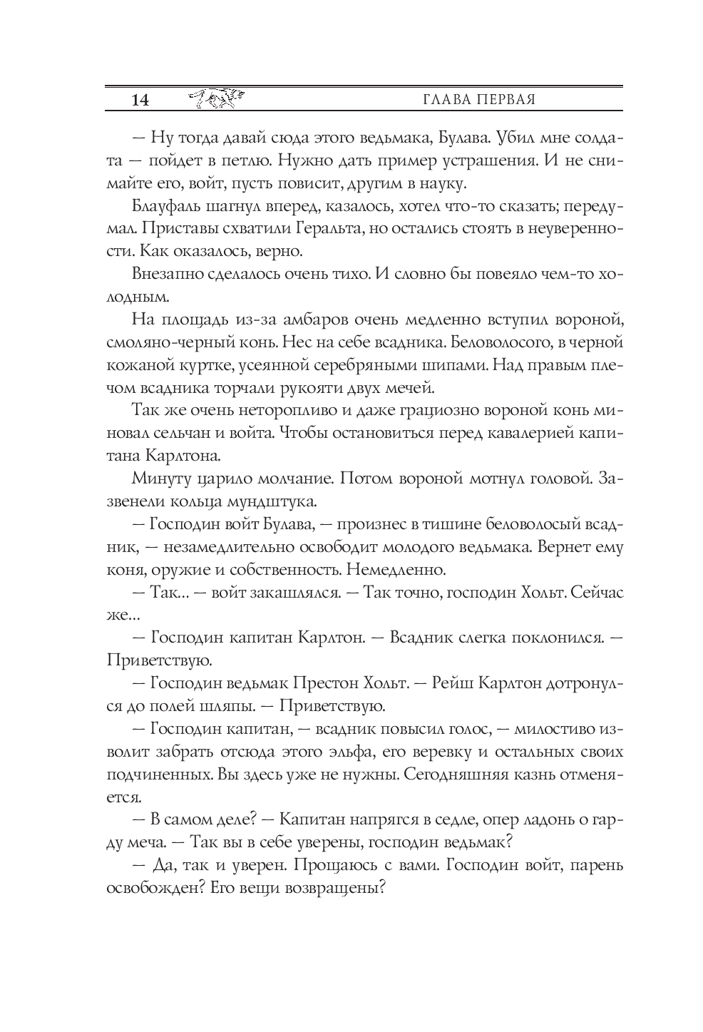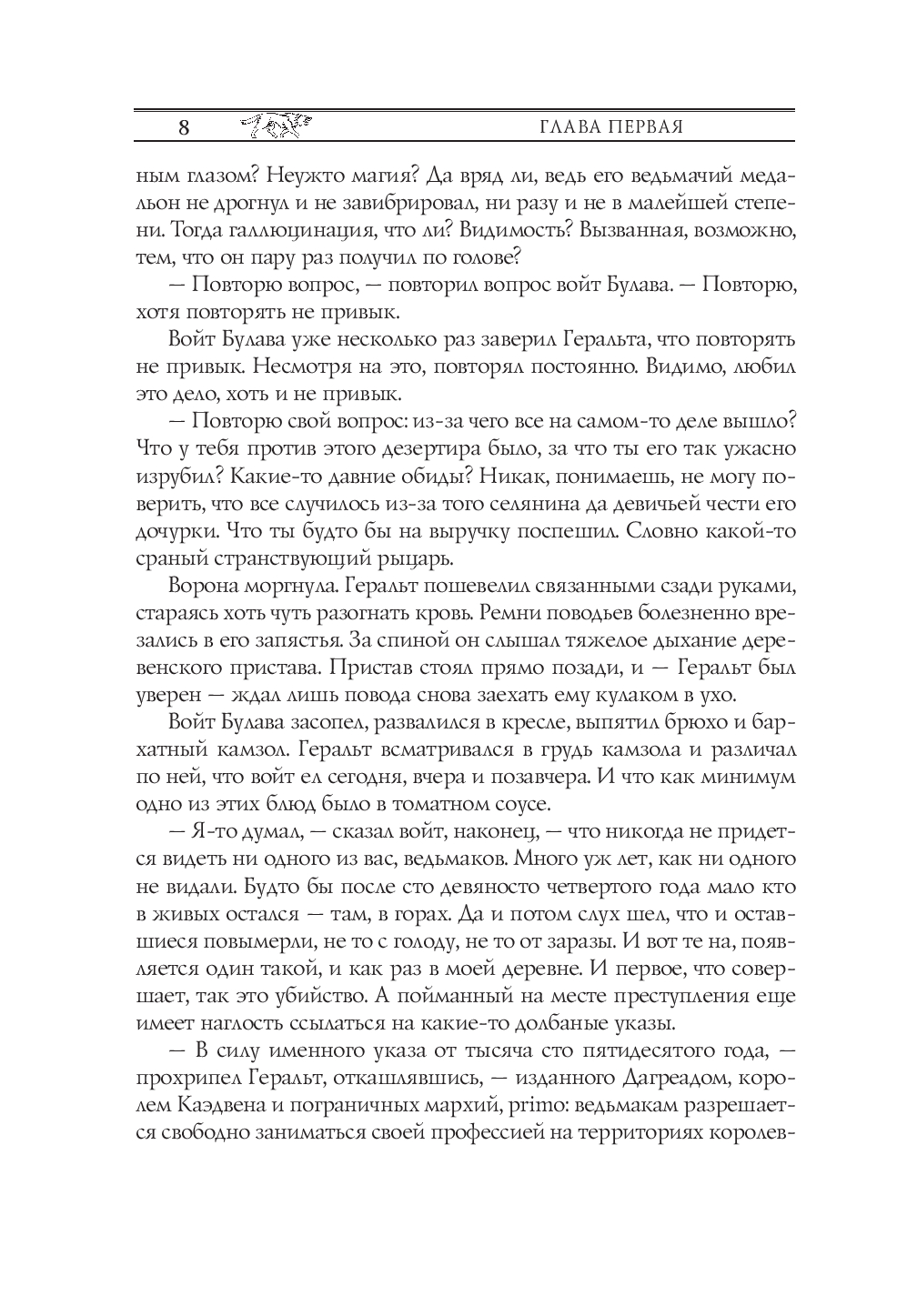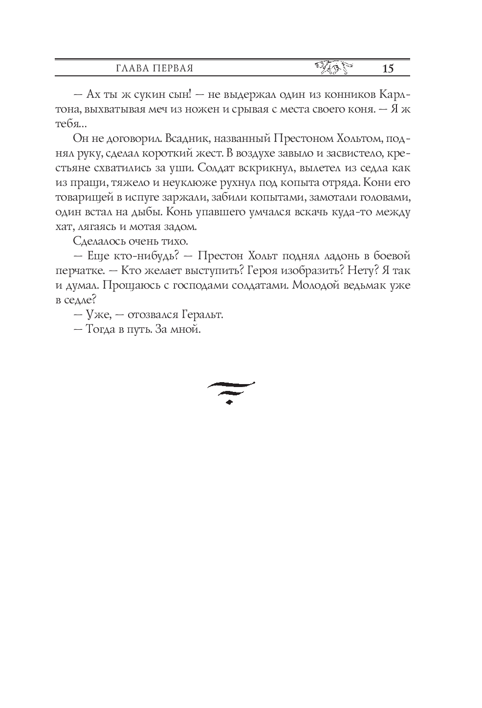 Закончились годы учебы, и Геральт покидает надежные стены крепости Каэр Морхен. Здесь, в обычном человеческом мире, экзамены ставит жизнь и пересдать их уже не получится. Малейший промах может обрушить карьеру юного ведьмака – страшные чудовища, таящиеся в сумраке лесных зарослей, кладбищ и пустырей, не так опасны, как люди, что улыбаются тебе в лицо, замышляя предательство.