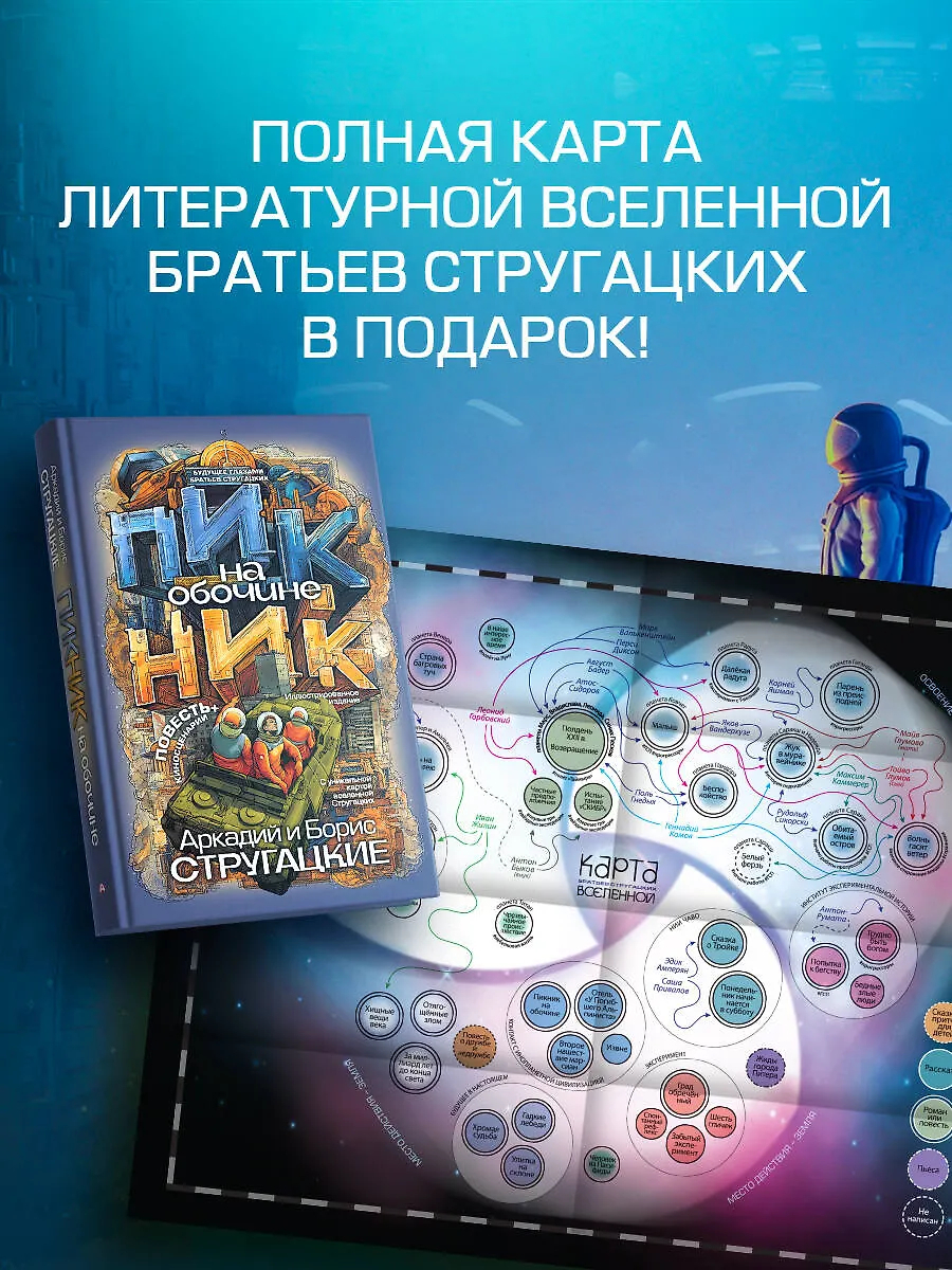 Под этой обложкой – текст "Пикника" плюс два киносценария, легших в основу легендарного "Сталкера" Тарковского. И главный подарок: карта литературного наследия авторов, которая увидит свет впервые. Целая вселенная Стругацких – произведения, персонажи, локации – в одной детализированной схеме.