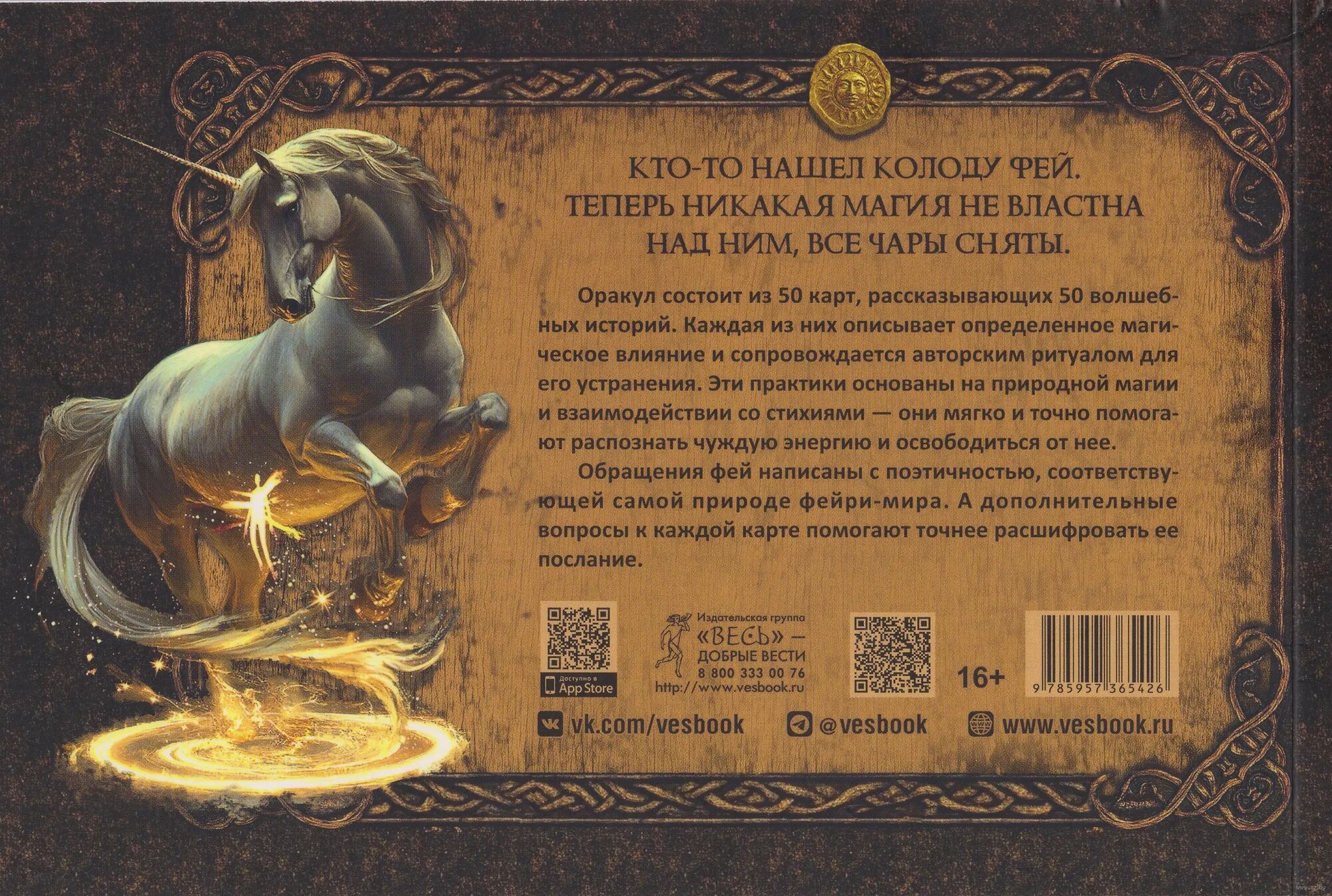 Не у всех есть возможность получить поддержку мастеров, практиков, тех, кто чувствует тонкий мир. В этом случае обнаружить и устранить чужое воздействие поможет новый оракул Арабо Саргсяна. Он был создан как навигатор по миру фейри – месту, где переплетаются мифы, магия и архетипы. Внутри колоды собраны ключевые фигуры и образы фейской традиции (Король фей, Дикая Охота, подменыш, угощение фей и др.). Освещаются темы фейской крови, магических печатей, скрытых порталов и следов, которые фейри могут оставить на судьбе человека. Каждая карта – это послание. Оно не всегда очевидно, но интуиция и внимание к деталям помогут его истолковать.