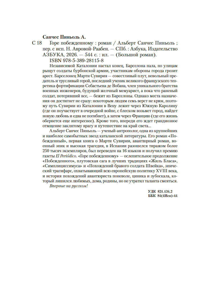 Альберт Санчес Пиньоль – ученый-антрополог, одна из крупнейших и наиболее самобытных звезд каталанской литературы. Его роман "Побежденный", первая книга о Марти Сувирии, авантюрный роман, военный эпик и высокая трагедия, в Испании разошелся тиражом более 250 тысяч экземпляров, был переведен на 16 языков и получил премию газеты El Periódico. "Горе побежденному" – ослепительное продолжение "Побежденного", плутовская сага в лучших традициях "Жиль Бласа", "Симплициссимуса" и "Похождений бравого солдата Швейка", эпический трагифарс, охватывающий всю европейскую политику XVIII века, и история похождений авантюриста поневоле, циника и зубоскала, который лишился любимых, дома, родины, но не утратил таланта смеяться.