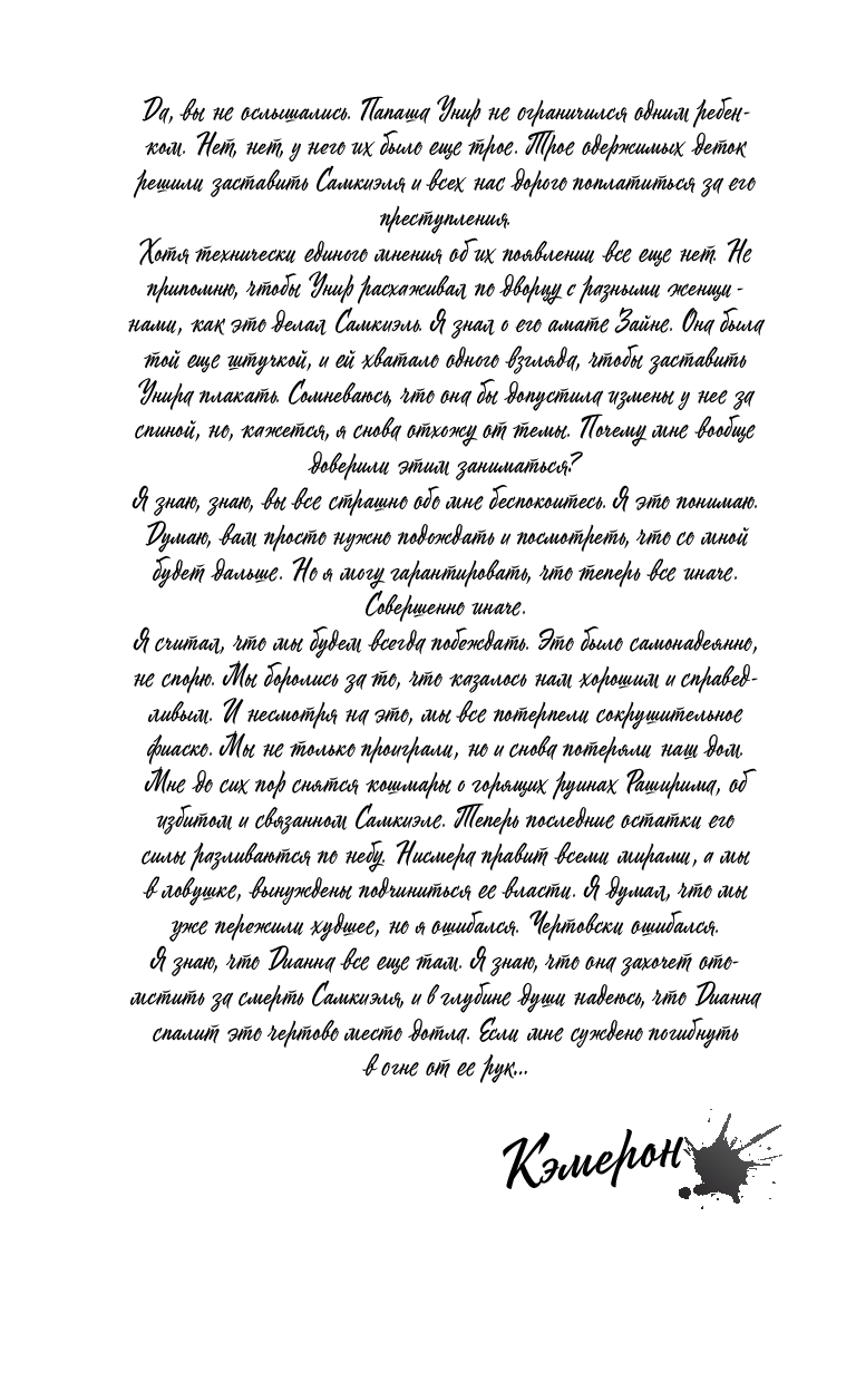 Отчаянно желая спасти возлюбленного, Дианна готова сжечь этот мир дотла, встать на путь войны и пожертвовать всем… даже своей душой. Однако для Самкиэля это слишком высокая цена. На руинах Раширима, в царстве хаоса, единственная, кто способна исцелить Самкиэля – Дианна. Но смогут ли они спастись или оба падут от клинка богини войны?