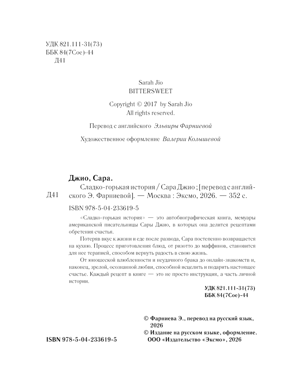 "Сладко-горькая история" – это автобиографическая книга, мемуары американской писательницы Сары Джио, в которых она делится рецептами обретения счастья.