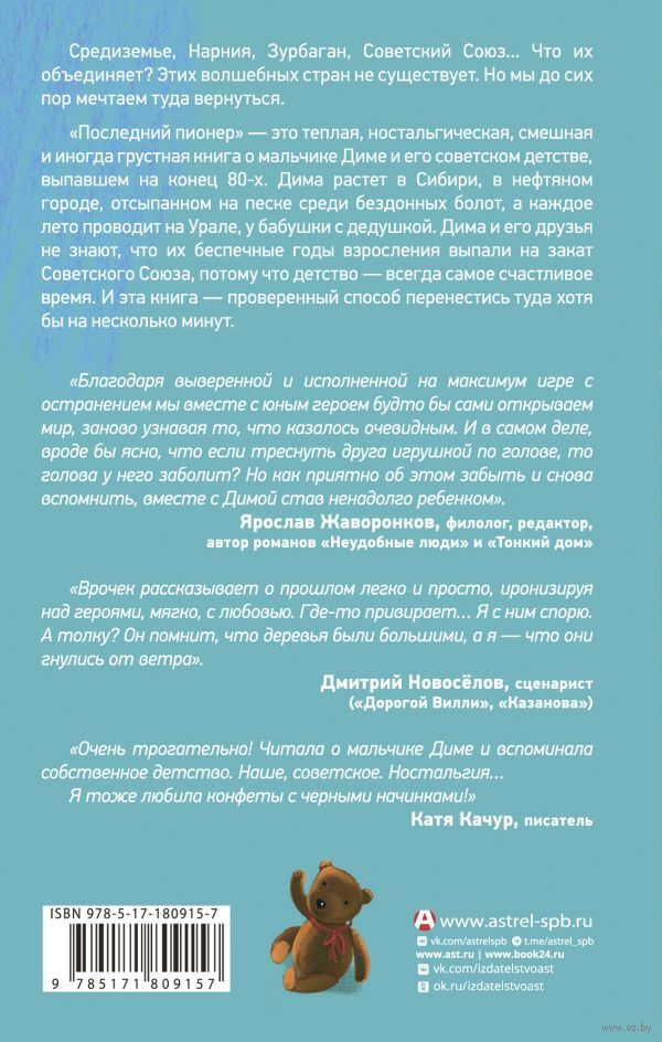 "Последний пионер" – это теплая, ностальгическая, смешная и иногда грустная книга о мальчике Диме и его советском детстве, выпавшем на конец 80-х. Дима растет в Сибири, в нефтяном городе, отсыпанном на песке среди бездонных болот, а каждое лето проводит на Урале, у бабушки с дедушкой. Дима и его друзья не знают, что их беспечные годы взросления выпали на закат Советского Союза, потому что детство – всегда самое счастливое время. И эта книга – проверенный способ перенестись туда хотя бы на несколько минут.
