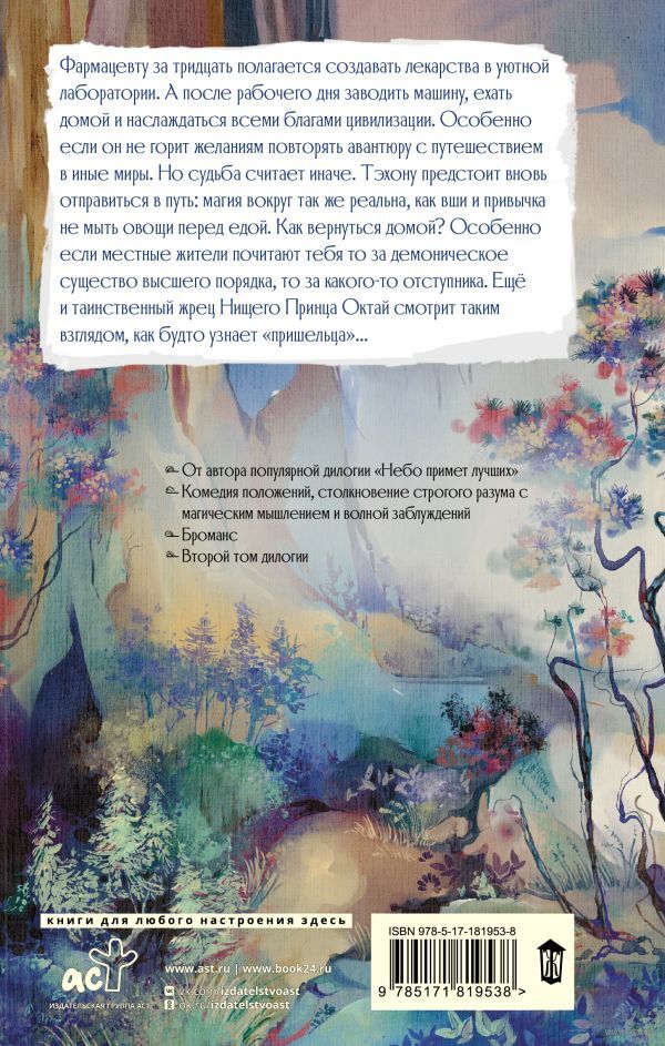 Фармацевту за тридцать полагается создавать лекарства в уютной лаборатории. А после рабочего дня заводить машину, ехать домой и наслаждаться всеми благами цивилизации. Особенно если он не горит желаниям повторять авантюру с путешествием в иные миры. Но судьба считает иначе. Тэхону предстоит вновь отправиться в путь: магия вокруг так же реальна, как вши и привычка не мыть овощи перед едой. Как вернуться домой? Особенно если местные жители почитают тебя то за демоническое существо высшего порядка, то за какого-то отступника. Ещё и таинственный жрец Нищего Принца Октай смотрит таким взглядом, как будто узнает "пришельца"...