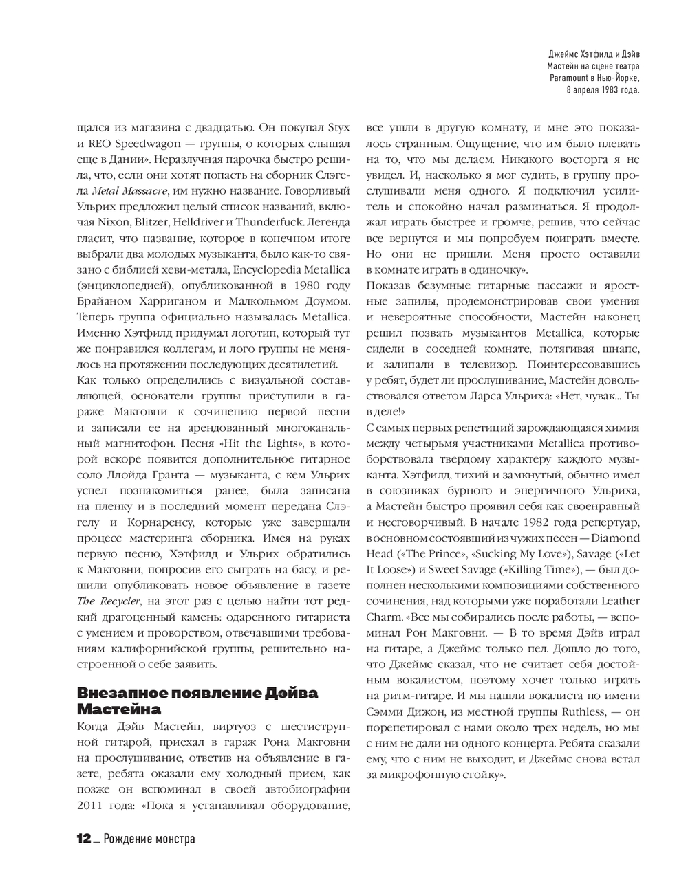 Узнайте из книги, зачем басист Джейсон Ньюстед перед началом каждой репетиции погружал свои гитары в ванную с кипятком? Как группа сорвала запись альбома Load, чтобы прилететь в другой город и сыграть трибьют-концерт для Motörhead? Как попытка сократить расходы пленки на "черном" альбоме лишь повысила продажи Metallica и привела их к ротациям на радио?