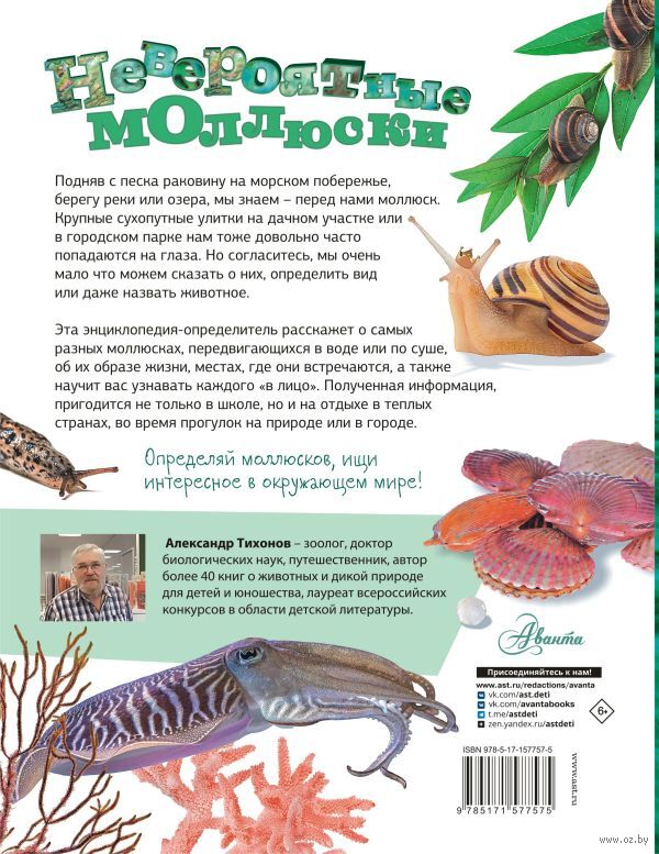 В книге рассказывается о морских, пресноводных и сухопутных моллюсках. Широко известные устрицы, мидии, жемчужницы, прудовики, катушки, ахатины, виноградные улитки, слизни, осьминоги, аргонавты, наутилусы, кальмары, каракатицы – все эти интереснейшие животные нашли свое место на страницах энциклопедии.