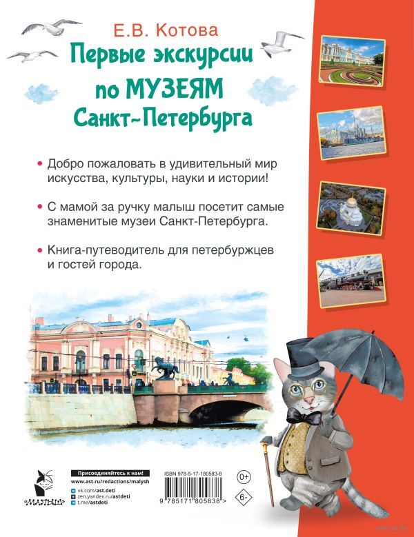 Из книги "Первые экскурсии по музеям Санкт-Петербурга" дети и взрослые узнают много интересного о самых известных музеях Санкт-Петербурга: когда, как и почему они были основаны, как до них добраться, что в них можно увидеть, в каких детских мастер-классах принять участие. Книга даст возможность маленькому читателю почувствовать уникальную атмосферу петербургских музеев и будет полезна не только жителям города и туристам, но и всем, кто интересуется историей, наукой и искусством.