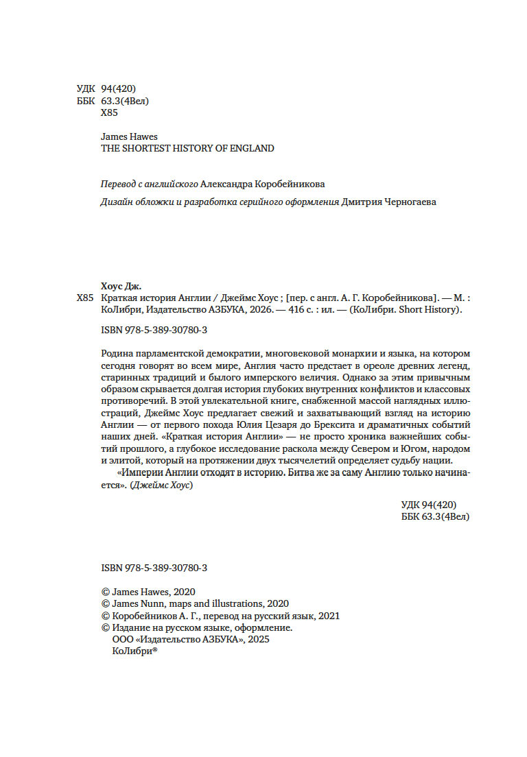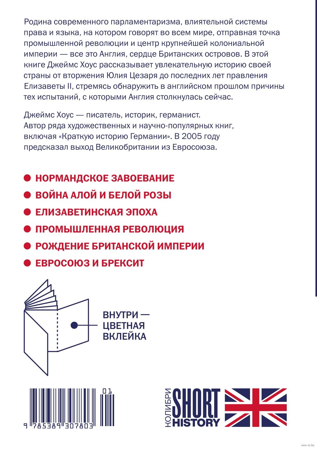 Родина парламентской демократии, многовековой монархии и языка, на котором сегодня говорят во всем мире, Англия часто предстает в ореоле древних легенд, старинных традиций и былого имперского величия. Однако за этим привычным образом скрывается долгая история глубоких внутренних конфликтов и классовых противоречий. В этой увлекательной книге, снабженной массой наглядных иллюстраций, Джеймс Хоус предлагает свежий и захватывающий взгляд на историю Англии – от первого похода Юлия Цезаря до Брексита и драматичных событий наших дней. "Краткая история Англии" – не просто хроника важнейших событий прошлого, а глубокое исследование раскола между Севером и Югом, народом и элитой, который на протяжении двух тысячелетий определяет судьбу нации.
