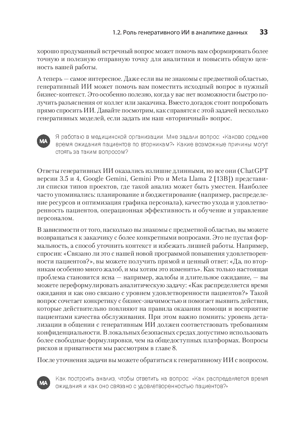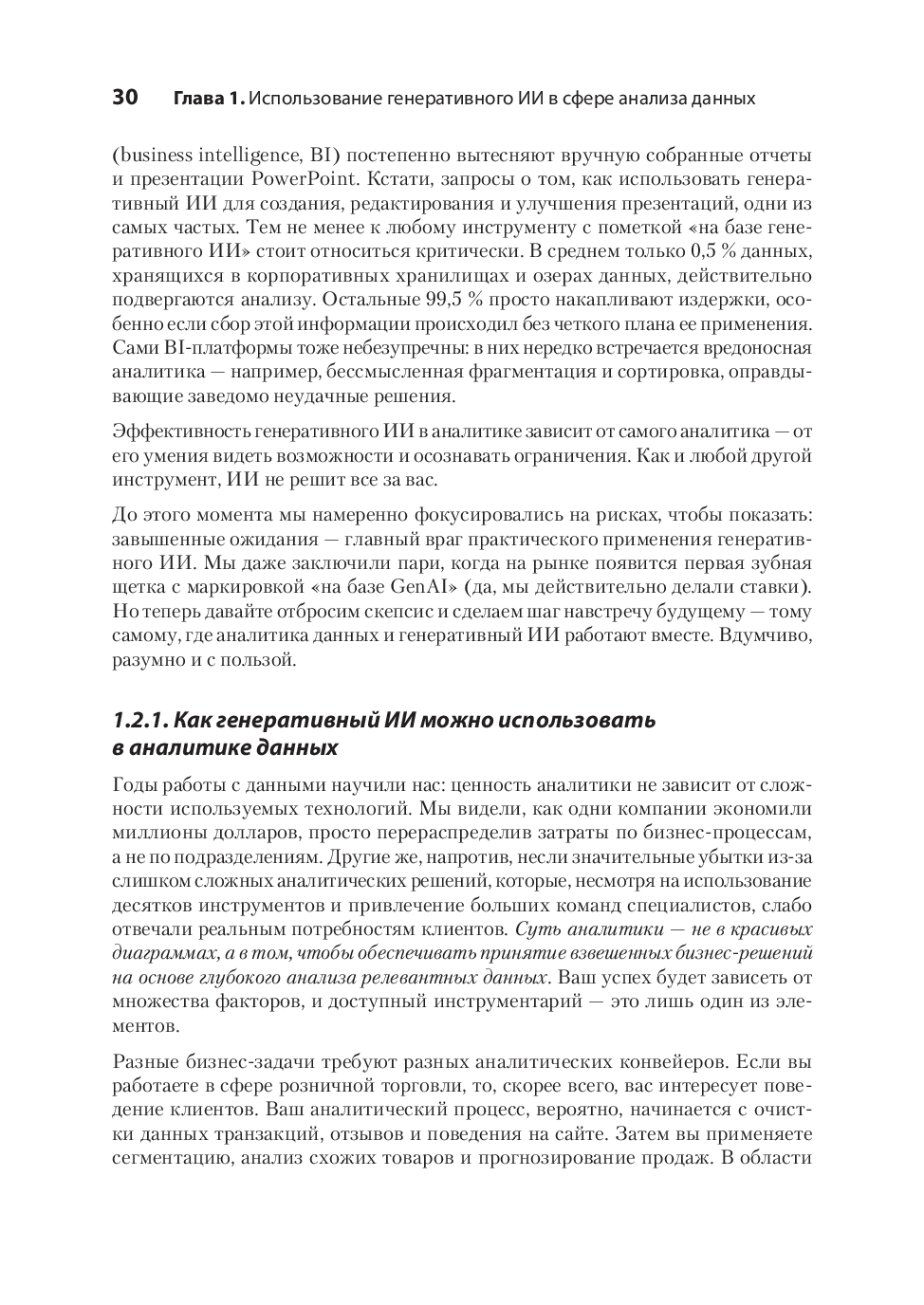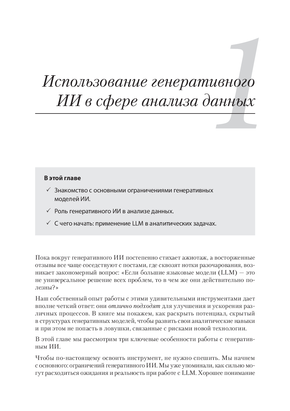 Эта книга – практическое руководство для тех, кто превращает данные в решения. Шаг за шагом вы разберетесь, как современные методы искусственного интеллекта помогают не просто интерпретировать массивы информации, но и находить скрытые закономерности, прогнозировать будущее и создавать конкурентные преимущества для бизнеса. Вы получите системное понимание инструментов анализа, узнаете о лучших практиках применения машинного обучения и научитесь интегрировать ChatGPT в ежедневные рабочие процессы.