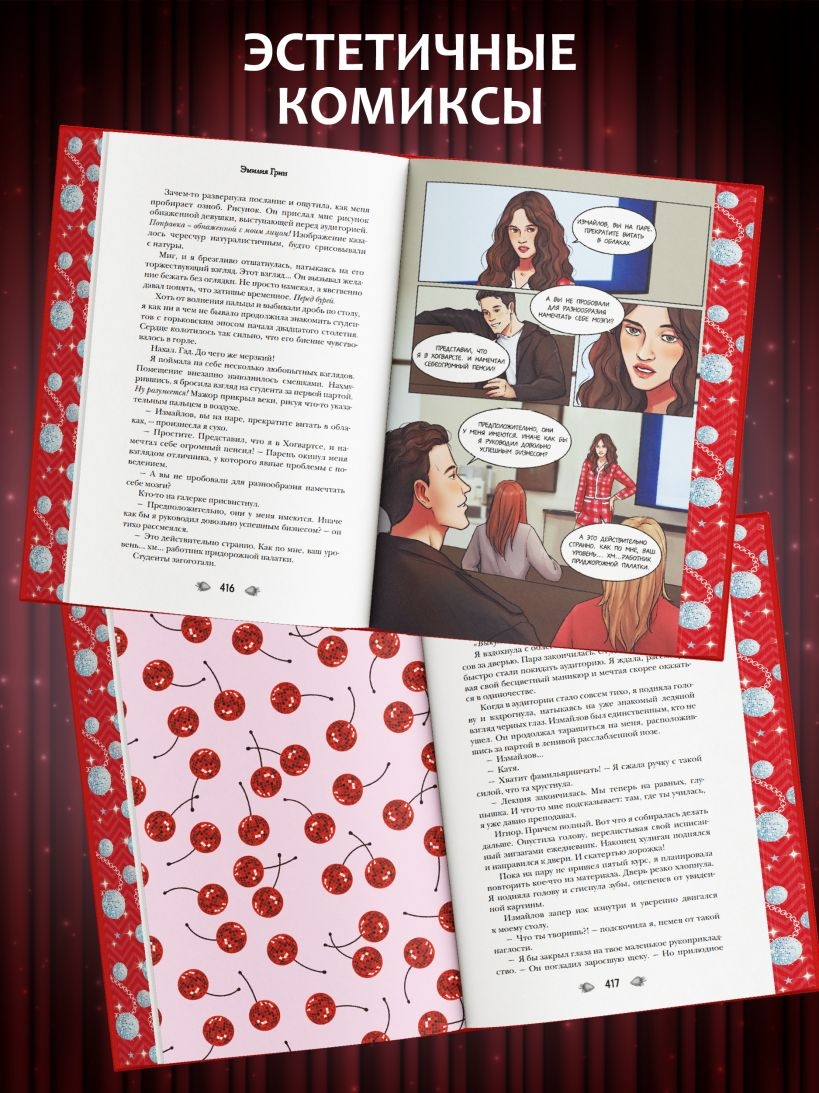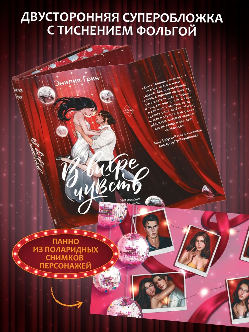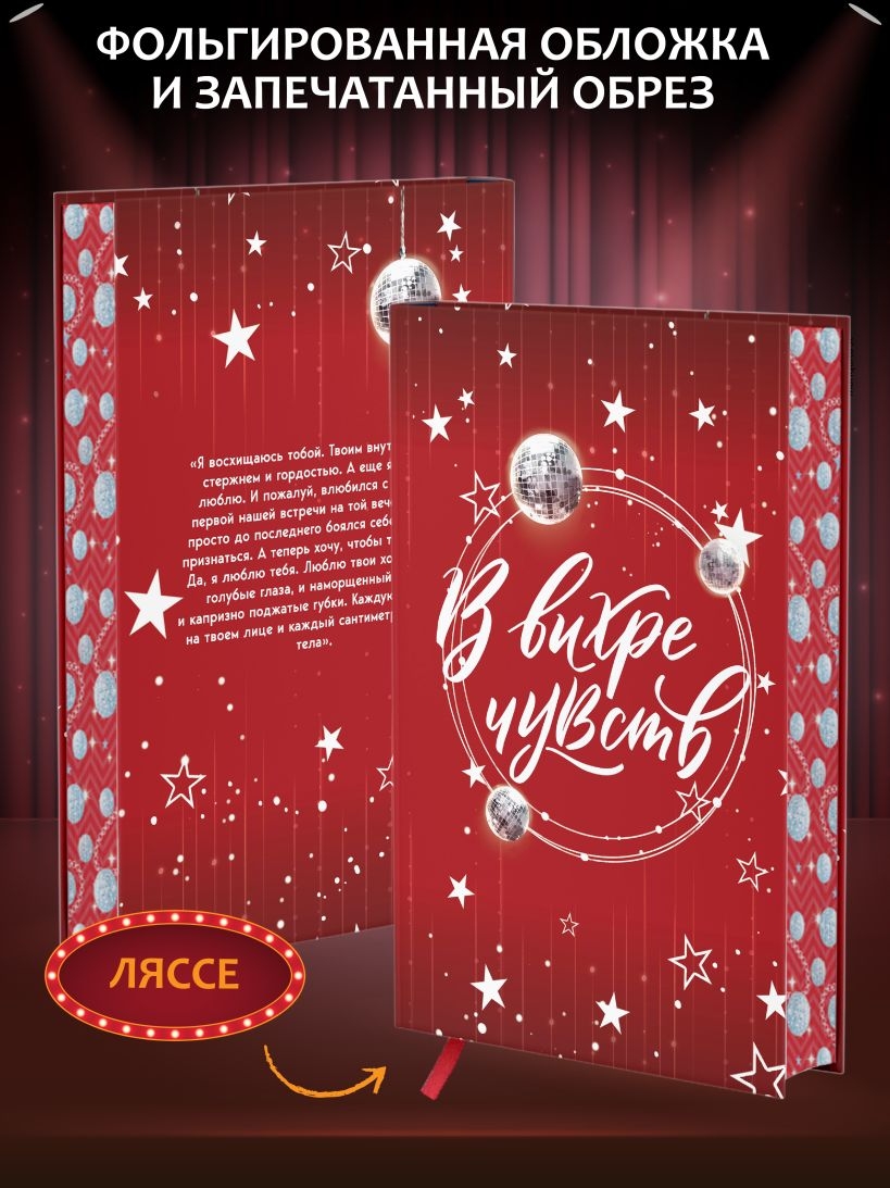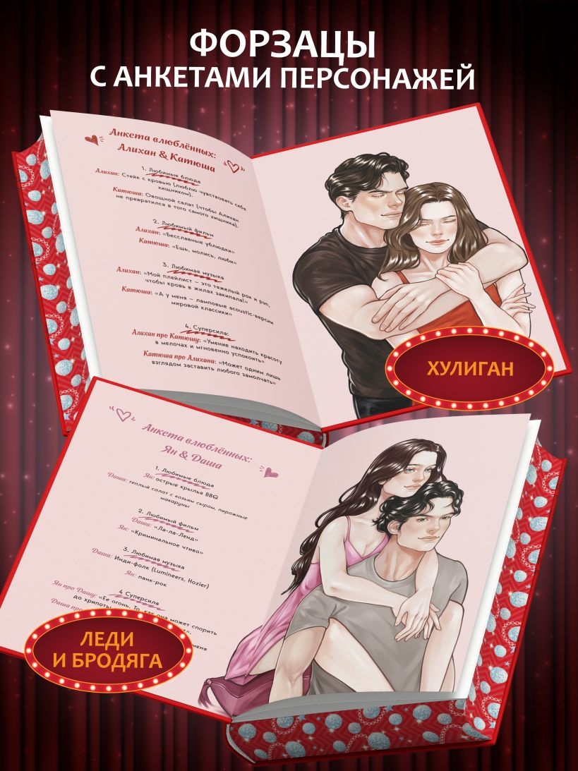 Внутри пять сюжетных иллюстраций и два мини-комикса, выполненные на мелованной бумаге. Эксклюзив – бонусная глава, которая еще нигде не публиковалась! Чтобы вам было удобно читать и останавливаться на любимых моментах, в книге есть бархатная ленточка ляссе, которая позволит не потерять нужную страничку! Под двусторонней суперобложкой скрывается сюрприз: одна сторона – это эффектный арт с героями на вечеринке, а другая – словно панно из стилизованных полароидных снимков любимых персонажей, которое можно снять и повесить на стену. Форзацы украшают изображения героев с их анкетами и переписками. На переплете использовано покрытие софт-тач, а звезды выполнены фольгой, которая переливается на свету! Яркий обрез украшает узор из звезд и диско-шаров. Это издание – лучший подарок поклонникам чувственных историй!