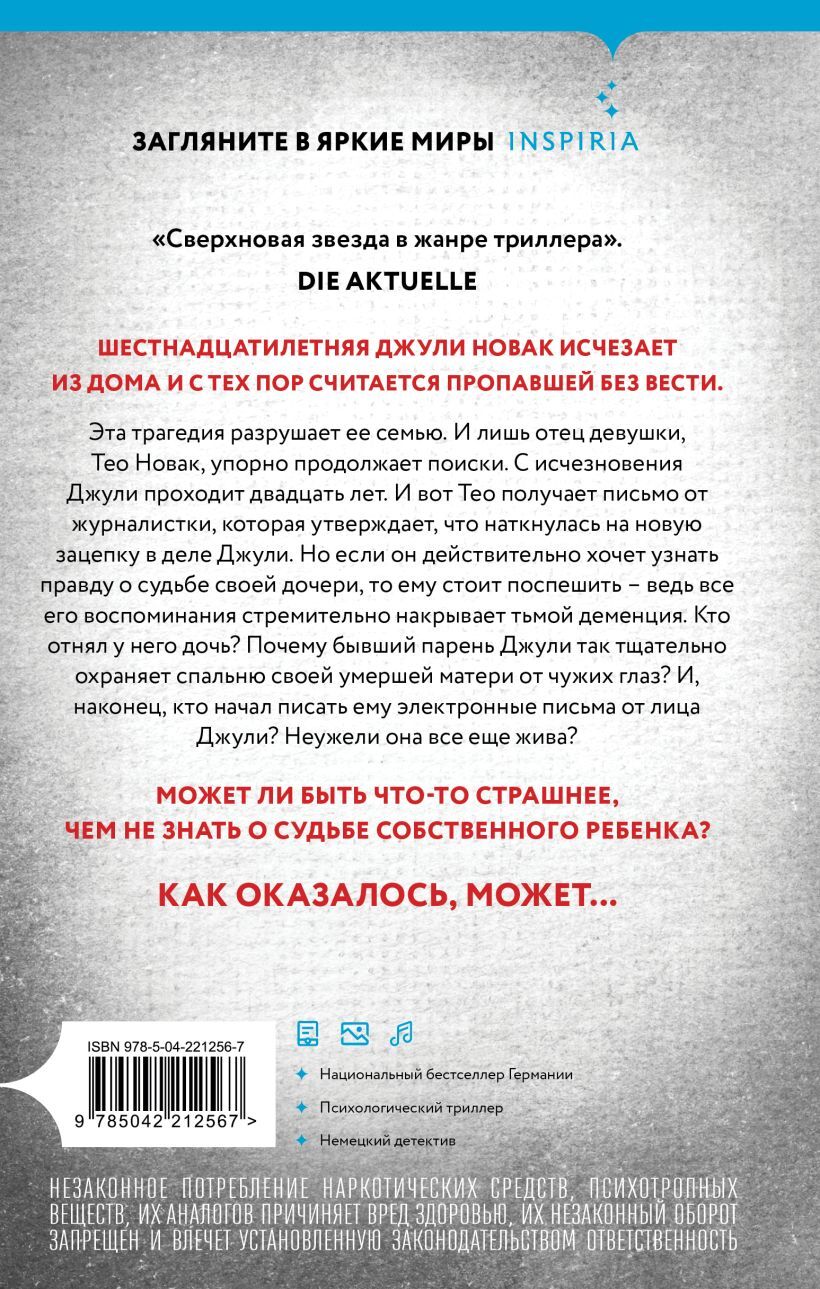 Шестнадцатилетняя Джули Новак исчезает из дома и с тех пор считается пропавшей без вести. Эта трагедия разрушает ее семью. И лишь отец девушки, Тео Новак, упорно продолжает поиски. С исчезновения Джули проходит двадцать лет. И вот Тео получает письмо от журналистки, которая утверждает, что наткнулась на новую зацепку в деле Джули. Но если он действительно хочет узнать правду о судьбе своей дочери, то ему стоит поспешить – ведь все его воспоминания стремительно накрывает тьмой деменция. Кто отнял у него дочь? Почему бывший парень Джули так тщательно охраняет спальню своей умершей матери от чужих глаз? И, наконец, кто начал писать ему электронные письма от лица Джули? Неужели она все еще жива?