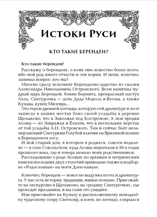 Прочитав данную книгу, вы познакомитесь с преданиями русской старины о древних прародителях славян. Эти предания созданы, прежде всего, загадочным и таинственным народом берендеев. Они сохранились и в народной памяти, и в рунических источниках, таких как "Велесова книга". Такого рода источники помогают по-новому осмыслить как священные тексты южной традиции – Веды Индии, Авесту, так и писания старых китайских историков, а также древнюю поэзию Востока.