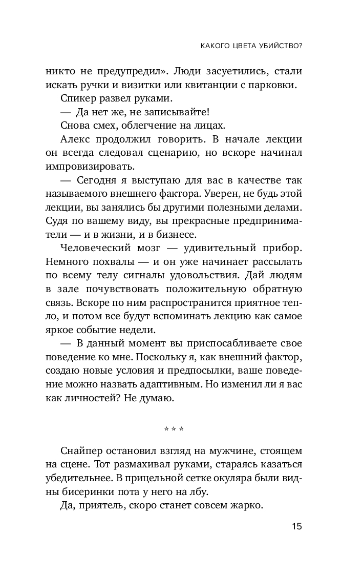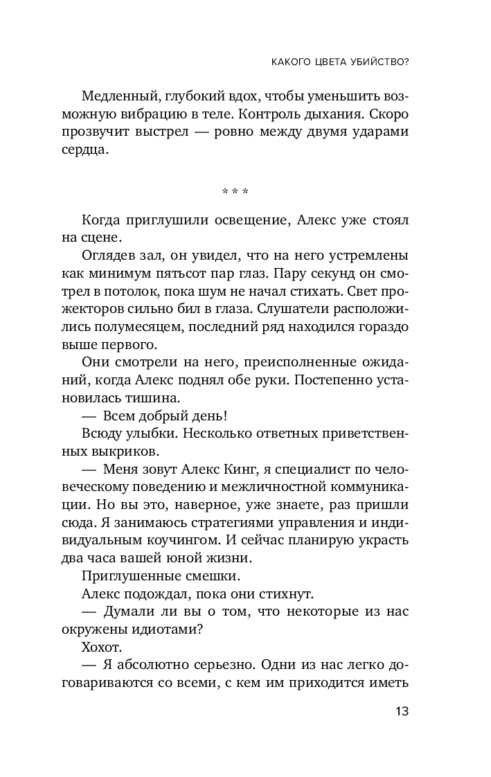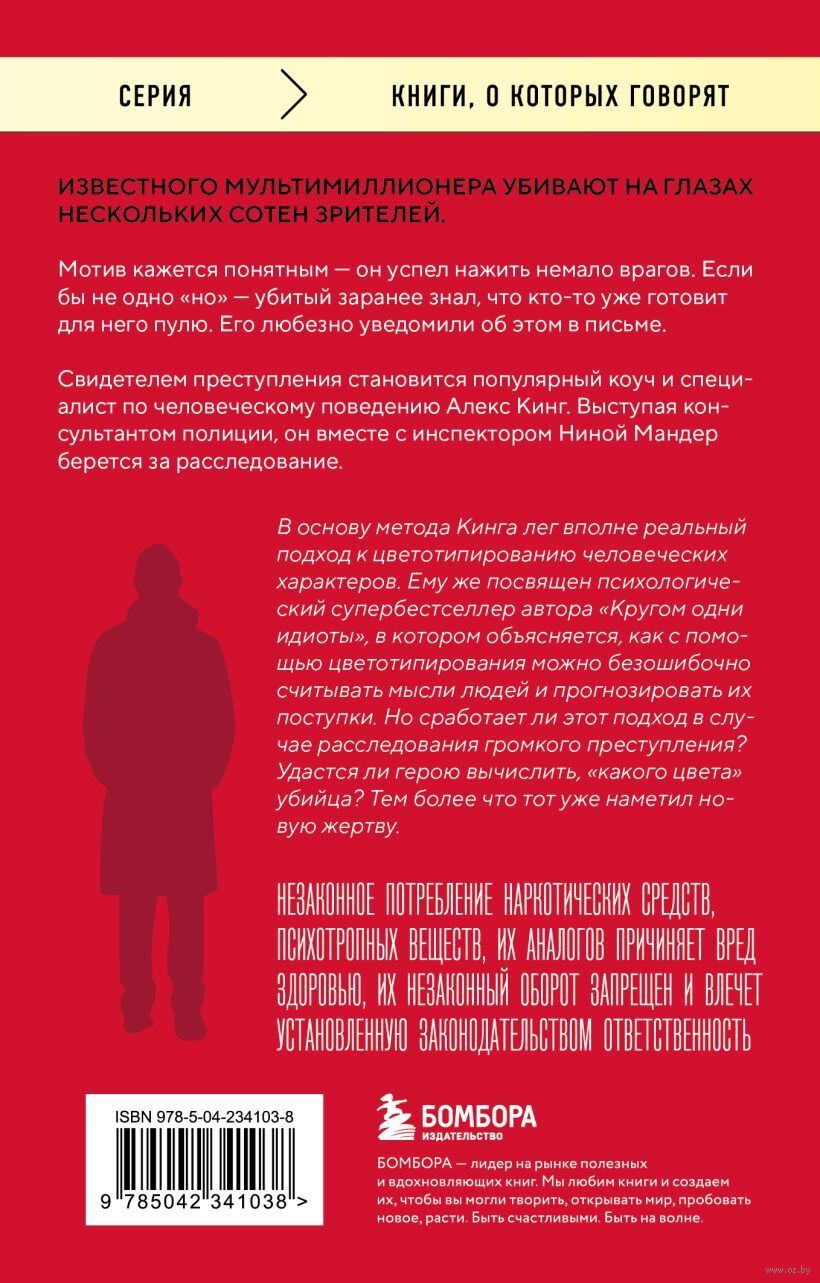 В основу метода Кинга лег вполне реальный подход к цветотипированию человеческих характеров. Ему же посвящён психологический супербестселлер автора "Кругом одни идиоты", в котором объясняется, как с помощью цветотипирования можно безошибочно считывать мысли людей и прогнозировать их поступки. Но сработает ли этот подход в случае расследования громкого преступления? Удастся ли герою вычислить, "какого цвета" убийца? Тем более что тот уже наметил новую жертву.