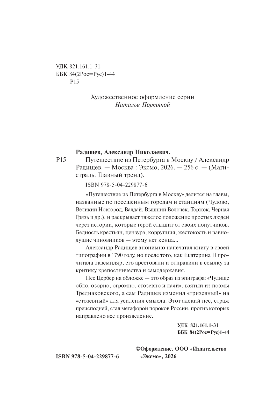 Пес Цербер на обложке – это образ из эпиграфа: "Чудище обло, озорно, огромно, стозевно и лаяй", взятый из поэмы Тредиаковского, а сам Радищев изменил "тризевный" на "стозевный" для усиления смысла. Этот адский пес, страж преисподней, стал метафорой пороков России, против которых направлено все произведение.
