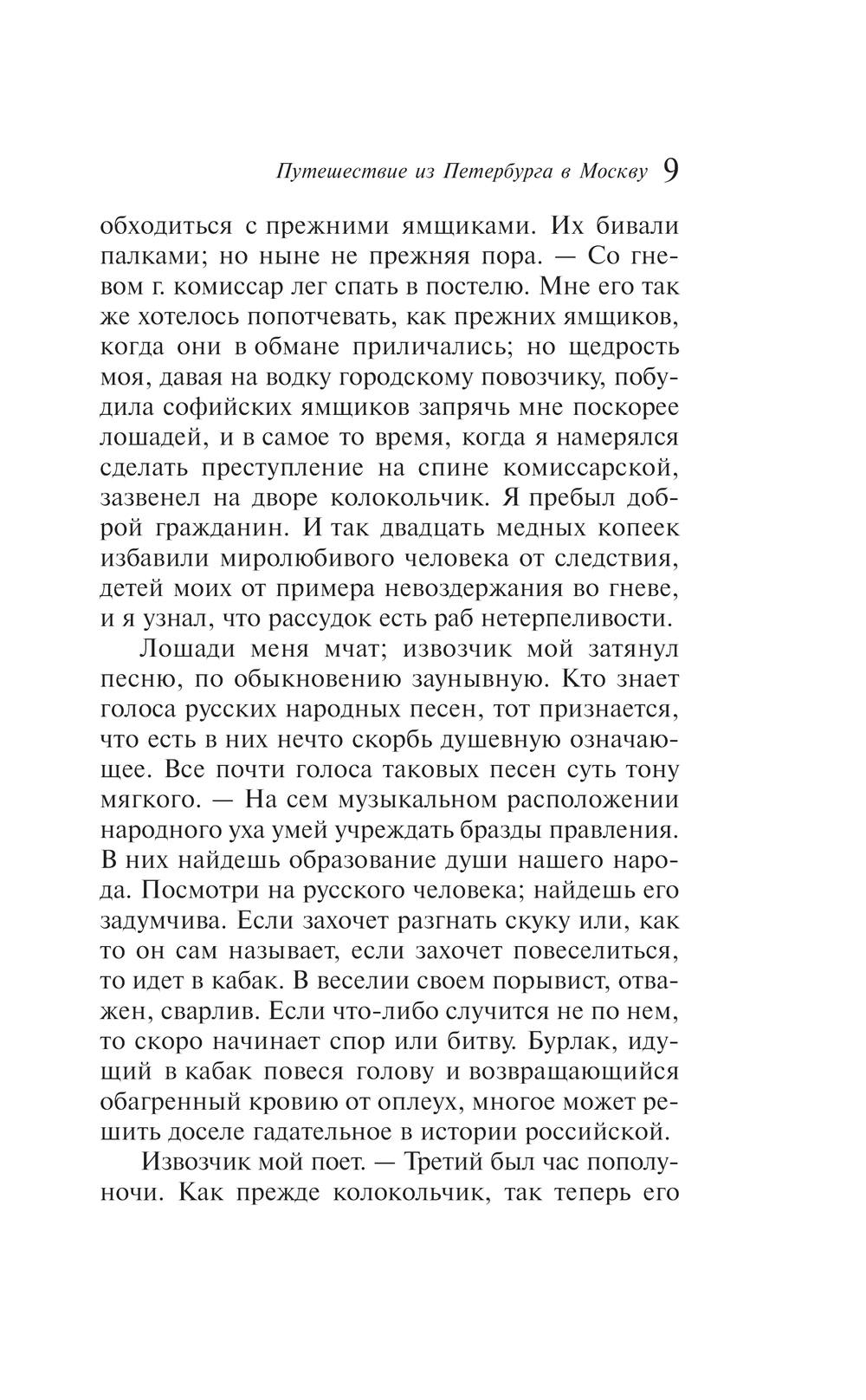 "Путешествие из Петербурга в Москву" делится на главы, названные по посещенным городам и станциям (Чудово, Великий Новгород, Валдай, Вышний Волочек, Торжок, Черная Грязь и др.), и раскрывает тяжелое положение простых людей через истории, которые герой слышит от своих попутчиков. Бедность крестьян, цензура, коррупция, жестокость и равнодушие чиновников – этому нет конца…