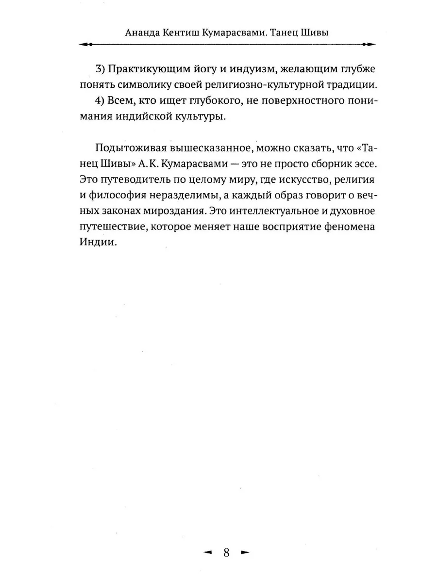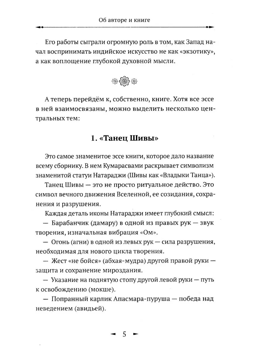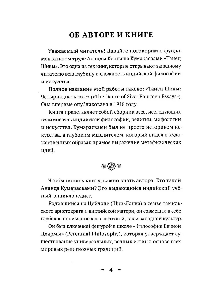Фундаментальный труд выдающегося индийского учёного-энциклопедисти Ананды Кентиша Кумарасвами (1877-1947). "Танец Шивы" – это классика искусствоведения и религиоведения, открывающая западному читателю глубину индийской философии и искусства. В данном труде раскрывается сокровенный смысл сакральных образов Индии и показывается, что искусство, религия и метафизика в этой традиции неразделимы.