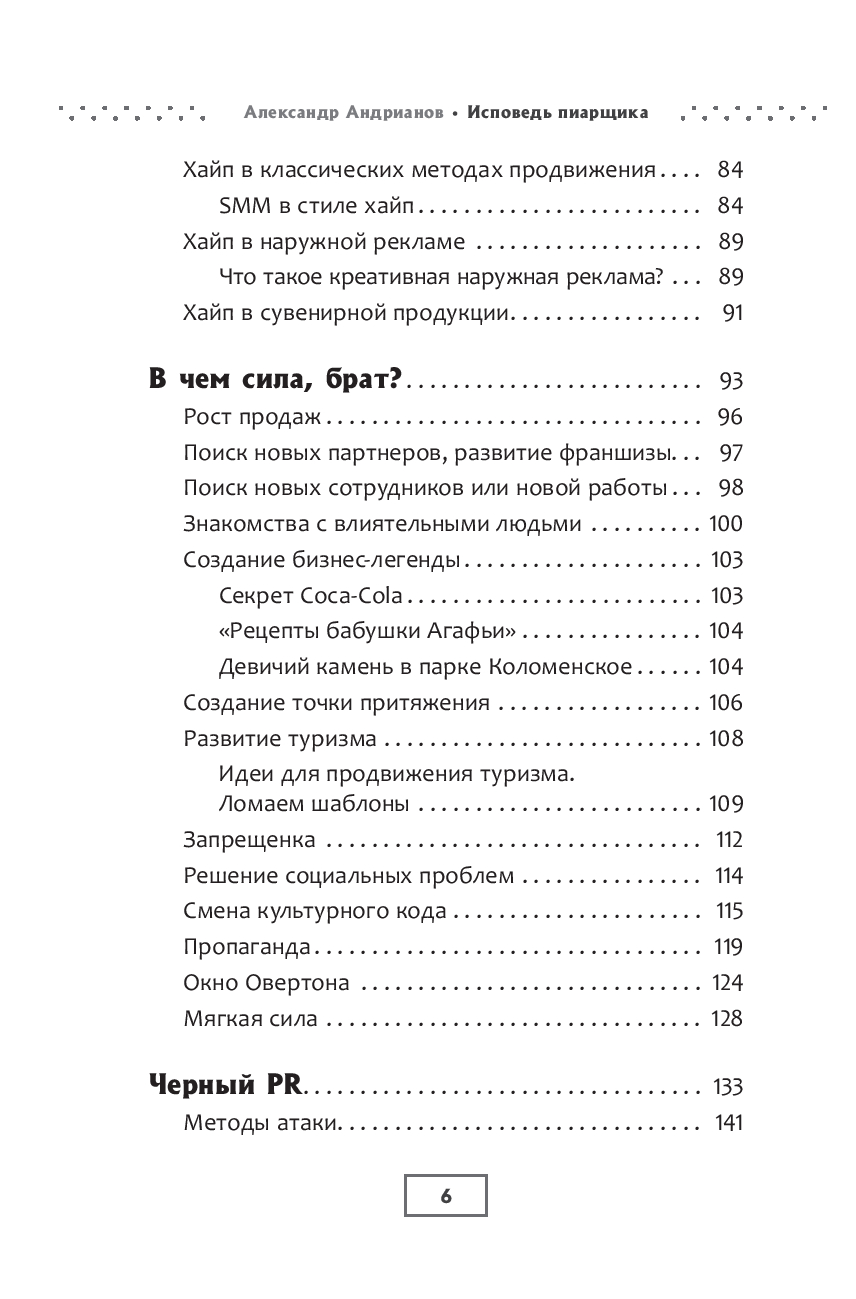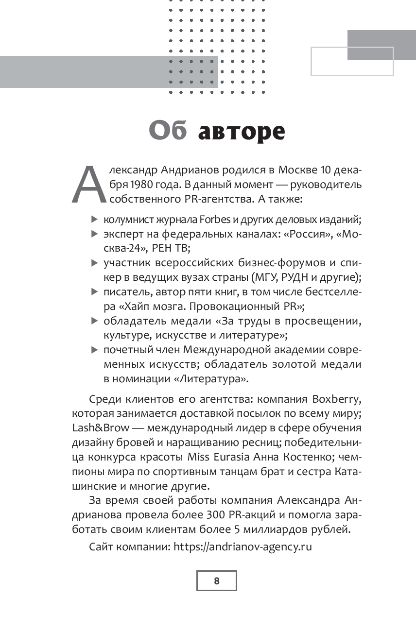 Александр Андрианов знакомит читателя со всем спектром методов продвижения. Вы узнаете о базовых принципах и преимуществах классического и вирусного пиара, получите практические рекомендации по работе с актуальными инфоповодами и взаимодействию со средствами массовой информации. Научитесь использовать в пиаре острые и даже табуированные темы, изучив основы методов пропаганды и убеждающего воздействия на аудиторию.