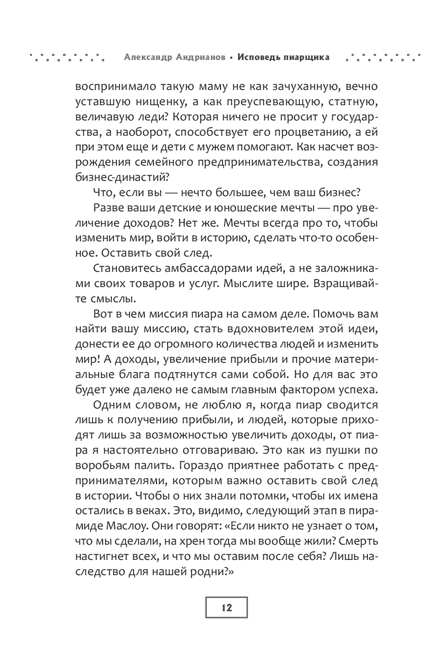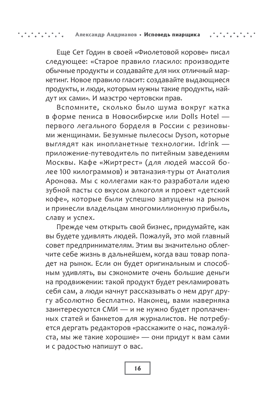 В современном мире для успешного ведения бизнеса недостаточно производить качественный продукт или оказывать услуги высокого уровня. Важно уметь заявить о себе, заинтересовать целевую аудиторию и привлечь внимание общественности. "Исповедь пиарщика" станет проводником в сферу пиара для тех, кто хочет научиться эффективно продвигать бренды, находить нестандартные подходы к рекламе, привлекать внимание прессы.