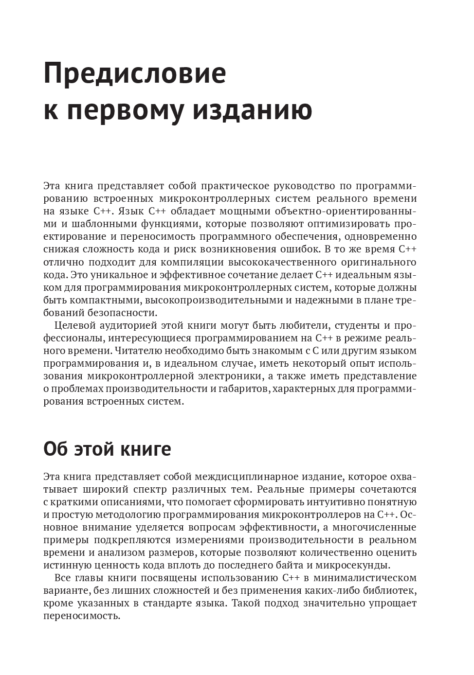 Книга представляет собой практическое руководство по программированию встроенных микроконтроллерных систем реального времени на языке C++. Она состоит из трех частей и содержит несколько приложений. Авторы уделяют особое внимание эффективности, поэтому многочисленные примеры в книге дополнены измерениями времени выполнения и анализом размера кода, что позволяет дать количественную оценку вычислительных затрат с точностью до байтов и микросекунд.