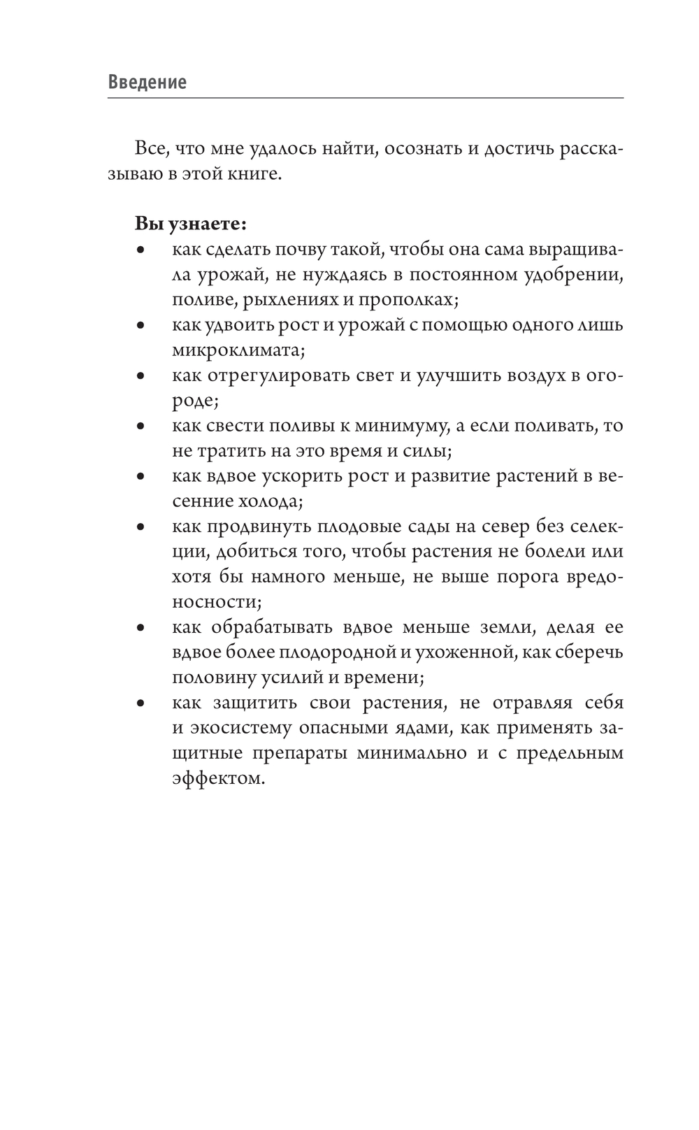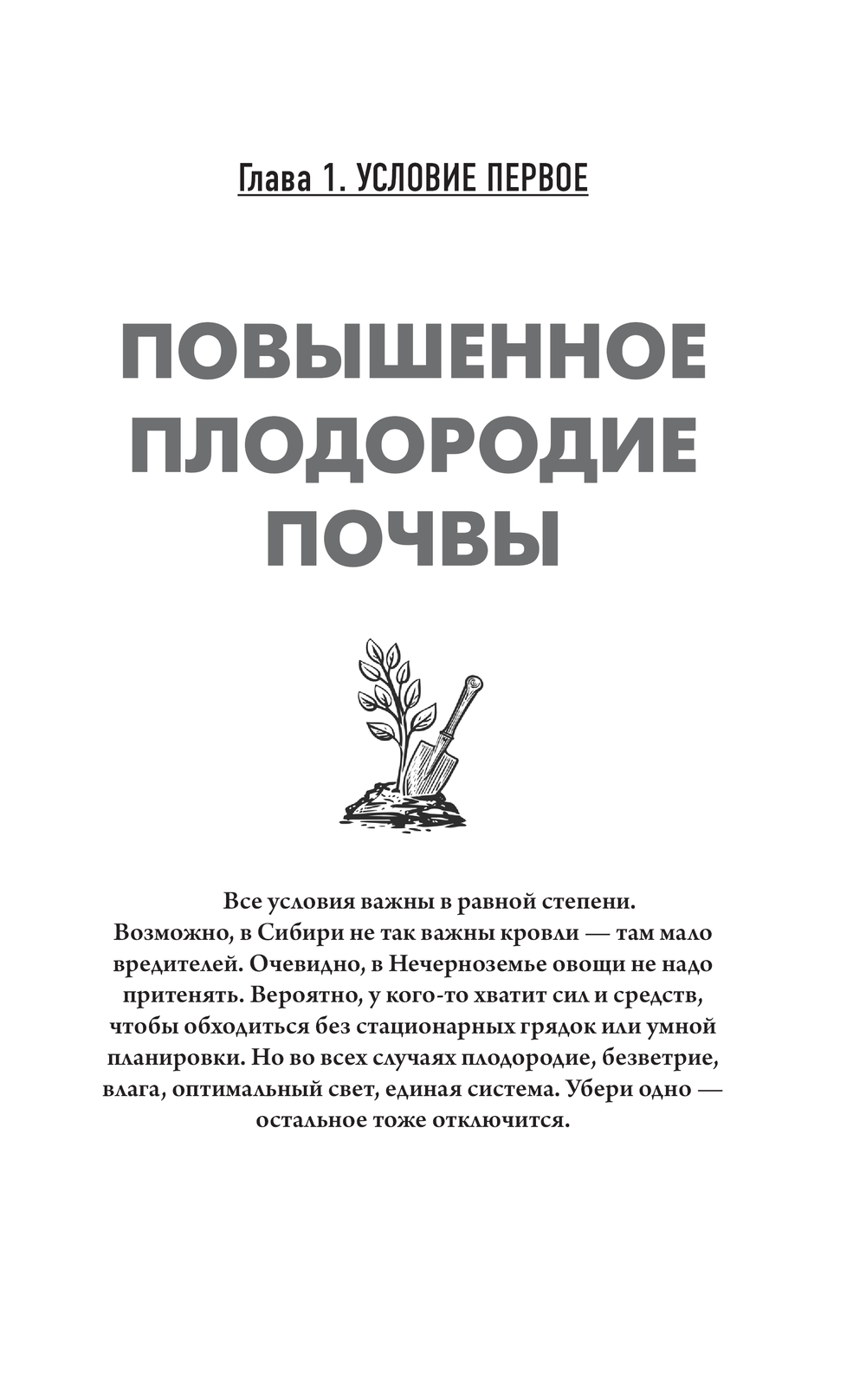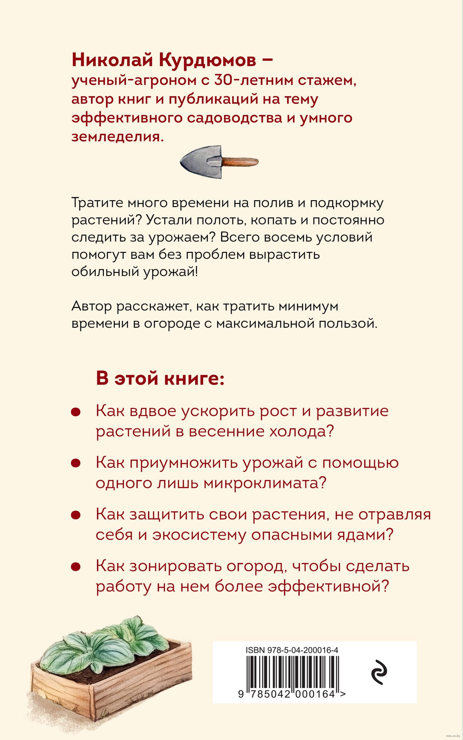 Если вы устали бесконечно полоть, копать, поливать и подкармливать растения, эта книга покажет, как работать меньше, а получать больше. Николай Курдюмов, ученый‑агроном с 30‑летним стажем и автор десятков книг по садоводству и земледелию, расскажет, как всего восемь ключевых условий помогут без лишних усилий вырастить обильный и здоровый урожай. Вы узнаете, как вдвое ускорить рост и развитие растений в весенние холода, как приумножить урожай, используя только правильно организованный микроклимат, а также как грамотно зонировать огород, чтобы каждая ваша минута на грядках приносила максимальную пользу. Это книга для тех, кто хочет перестать быть "рабом огорода" и наконец-то сделать землю своим союзником, а не источником бесконечного труда.