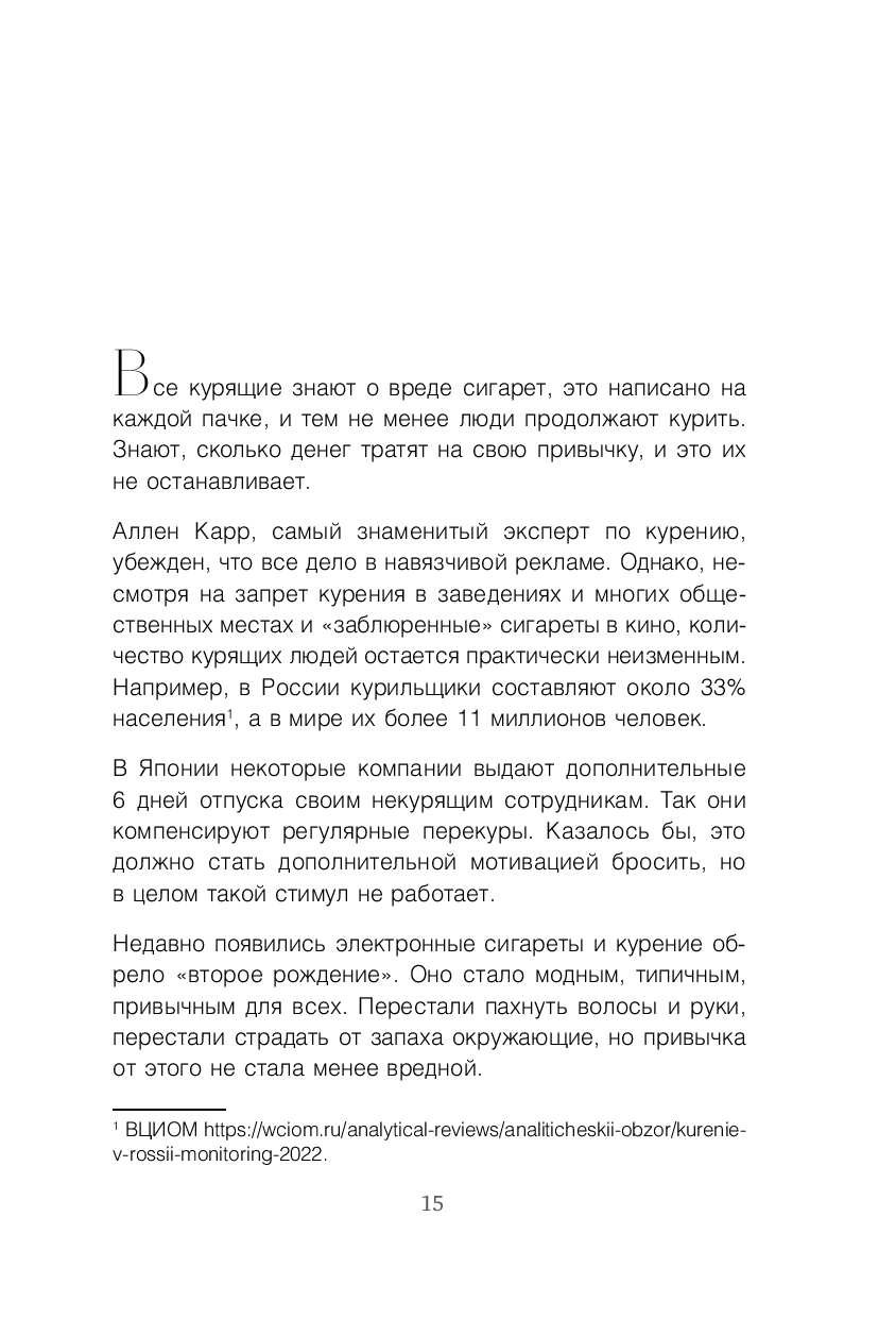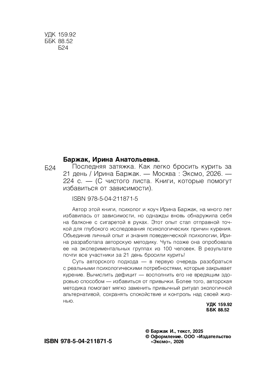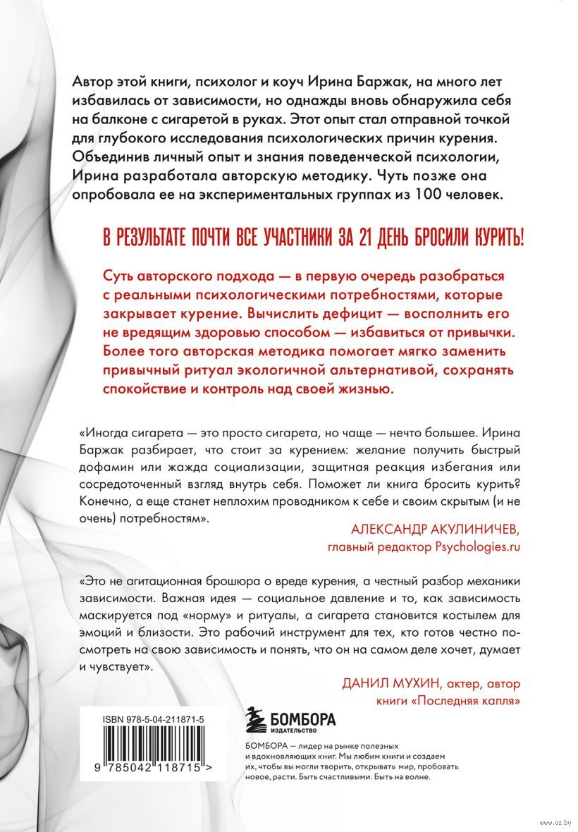 Автор этой книги, психолог и коуч Ирина Баржак, на много лет избавилась от зависимости, но однажды вновь обнаружила себя на балконе с сигаретой в руках. Этот опыт стал отправной точкой для глубокого исследования психологических причин курения. Объединив личный опыт и знания поведенческой психологии, Ирина разработала авторскую методику. Чуть позже она опробовала ее на экспериментальных группах из 100 человек. В результате почти все участники за 21 день бросили курить!