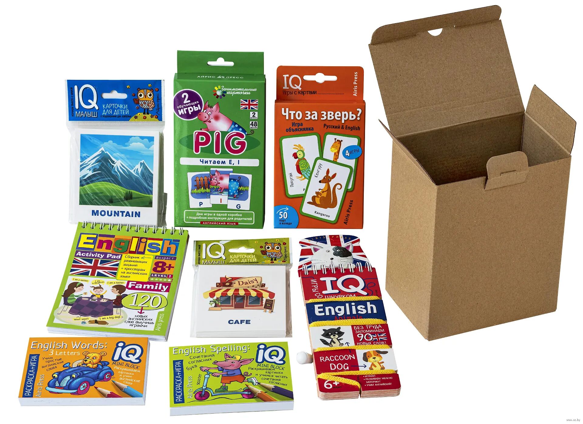 В комплект входят: – мини-раскраски "English": "Сочетания согласных букв" и "Учим слова из 3 букв"; – наборы карточек "Умный малыш. English": "Город" и "Природа"; – игры с картами "Что за зверь? Игра объяснялка"; – IQ-блокнот "Семья"; – набор занимательных карточек "Поросенок. Читаем E, I. Level 2"; – игры со шнурком "English. Животные".
