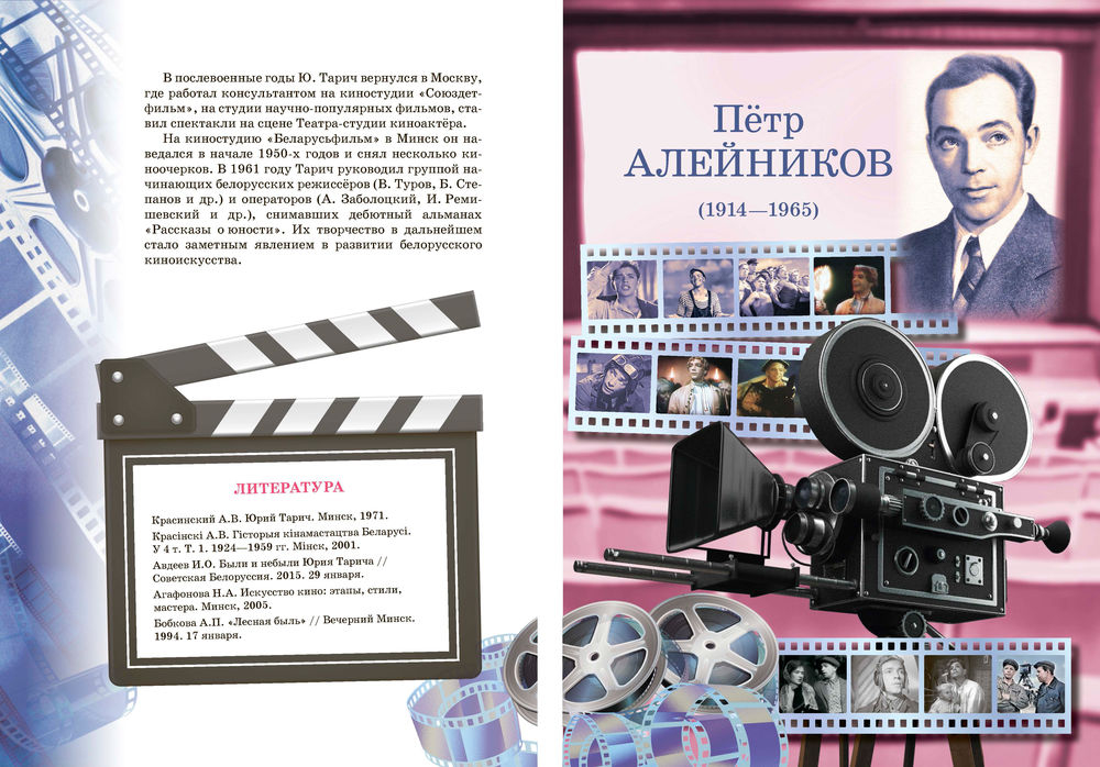 В книге в популярной форме рассказывается об известных мастерах кино, жизнь и творчество которых тесно связаны с Беларусью. Режиссёр Юрий Тарич известен как основоположник белорусского кино и автор первого белорусского фильма "Лесная быль". Актёр Пётр Алейников родился и вырос в Беларуси, создал неповторимые и яркие образы в популярных фильмах, среди которых "Семеро смелых", "Трактористы" и "Большая жизнь". Режиссёры Владимир и Елена Петкевич своими выразительными анимационными лентами принесли европейскую славу белорусской мультипликации.