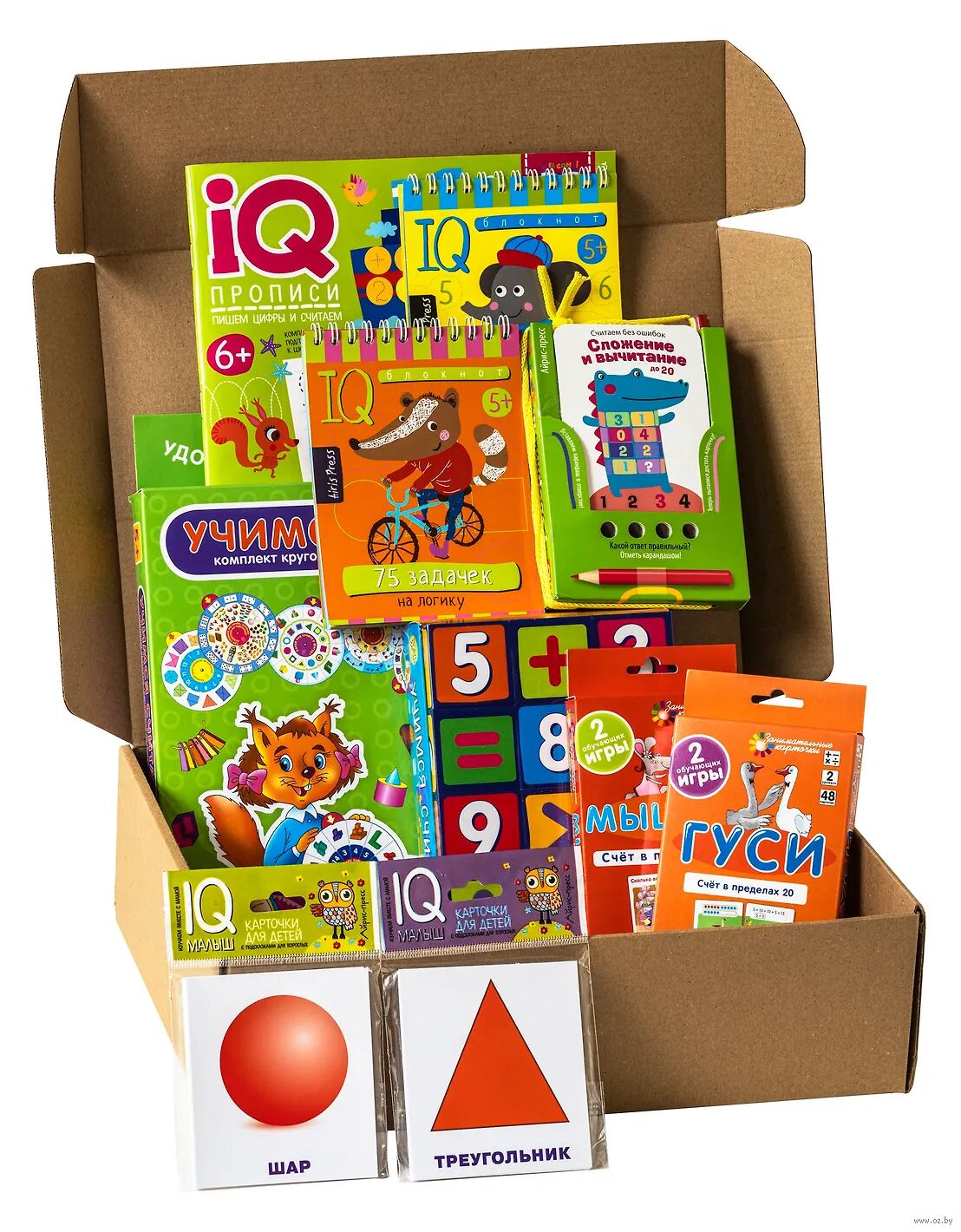 В комплект входят:- наборы карточек "Умный малыш": "Плоские фигуры" и "Объёмные фигуры"; – комплект круговых тренажёров "Учимся считать"; – блокноты "75 задачек на логику" и "75 судоку и магических квадратов"; – занимательные карточки "Мышата. Счёт в пределах 10" и "Гуси. Счёт в пределах 20"; – Проверяй-ка "Считаем без ошибок. Сложение и вычитание до 20"; – IQ-прописи "Пишем цифры и считаем"; – кубики "Учимся считать".