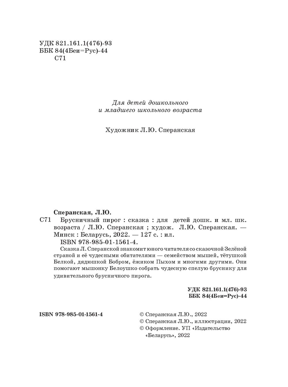 Сказка знакомит юного читателя со сказочной Зелёной страной и её чудесными обитателями – семейством мышей, тётушкой Белкой, дядюшкой Бобром, ёжиком Пыхом и многими другими. Они помогают мышонку Белоушко собрать чудесную спелую бруснику для удивительного брусничного пирога.