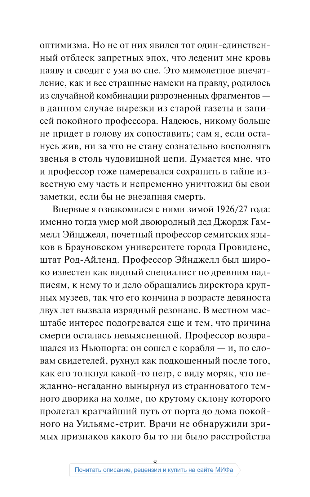 "Эдгар По XX века", после смерти обретший множество литературных преемников, среди которых Стивен Кинг и Нил Гейман, – при жизни Лавкрафт был практически неизвестен. Его культовый "Зов Ктулху" рождался в пору отчаяния, нужды и неудач – из кошмаров, преследовавших писателя с самого детства.