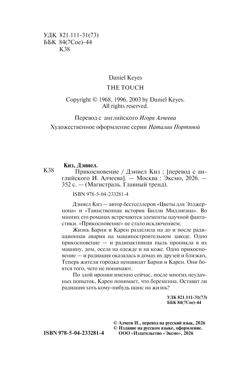 Дэниел Киз – автор бестселлеров "Цветы для Элджернона" и "Таинственная история Билли Миллигана". Во многих его романах встречаются элементы научной фантастики. "Прикосновение" не стало исключением.