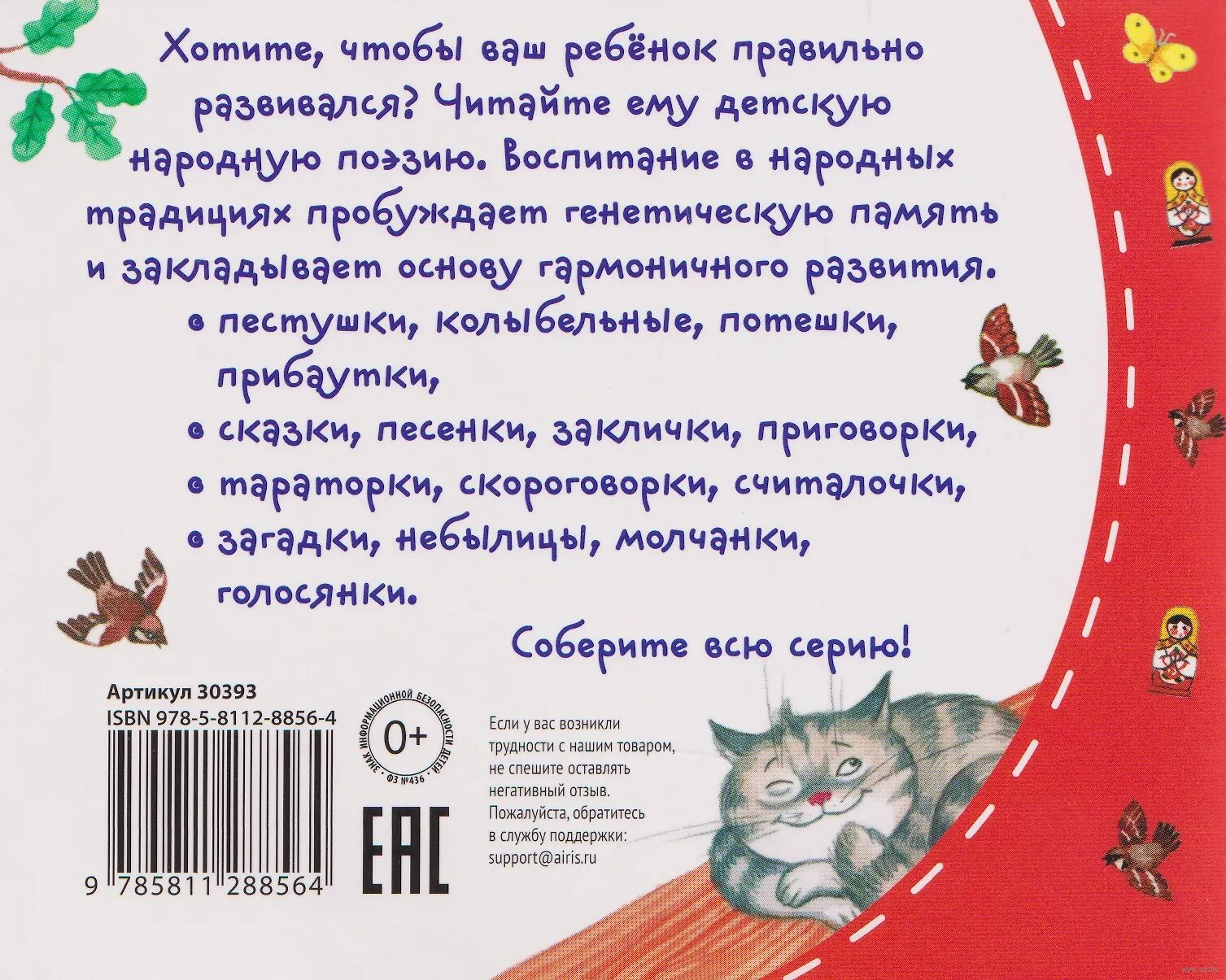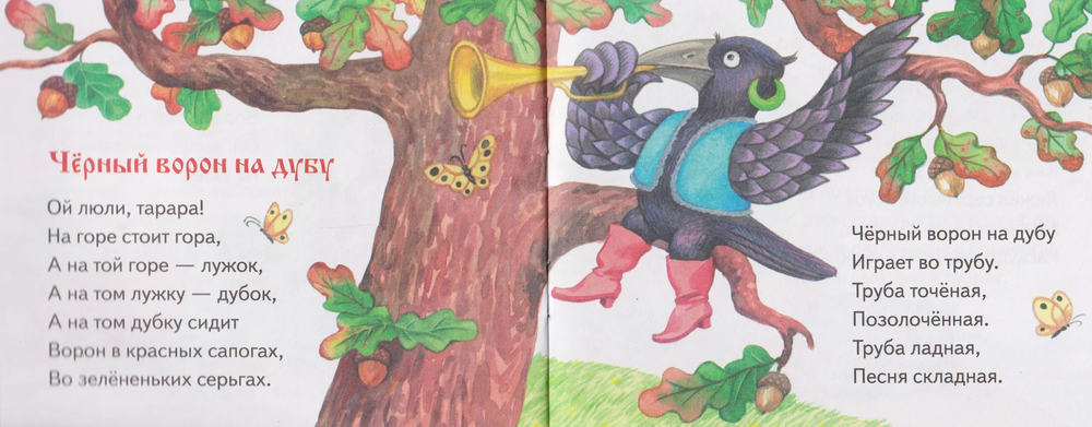 Книжка представляет собой сборник народных сказок и песенок. Они отличаются особой выразительностью и мелодичностью. Несколько фраз, и перед глазами возникает целая картина с яркими образами. Певучий язык, словесные повторы, чёткие рифмы помогают ребёнку быстро запомнить весёлые истории.