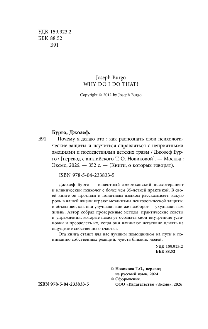 Джозеф Бурго – психолог с более чем 35-летней практикой – помогает читателю шаг за шагом разобраться в собственных защитных механизмах и научиться управлять эмоциями осознанно.