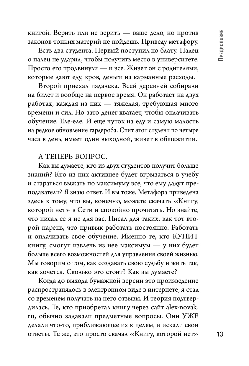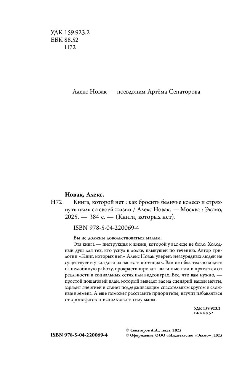 Эта книга – инструкция к жизни, которой у вас еще не было. Холодный душ для тех, кто уснул в лодке, плывущей по течению. Автор трилогии "Книг, которых нет" Алекс Новак уверен – незаурядных людей не существует и у каждого из нас есть потенциал. Вам не обязательно ходить на нелюбимую работу, прокрастинировать шаги к мечтам и прятаться от реальности в социальных сетях или видеоиграх. Все, что вам нужно – простой пошаговый план, который выведет вас на сценарий вашей мечты, зарядит энергией и станет поддерживающим спасательным кругом в сложные времена. А еще – поможет расставить приоритеты, научит избавляться от хронофагов и использовать силу маны. Читайте "трилогию, которой нет" от Алекса Новака, чтобы стать лучшей версией себя.